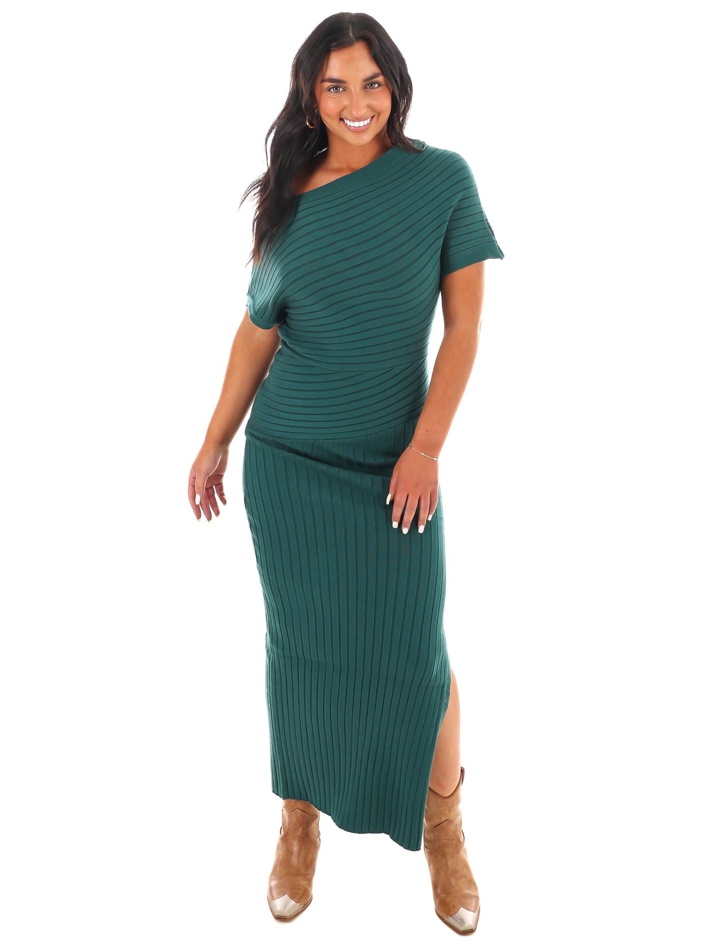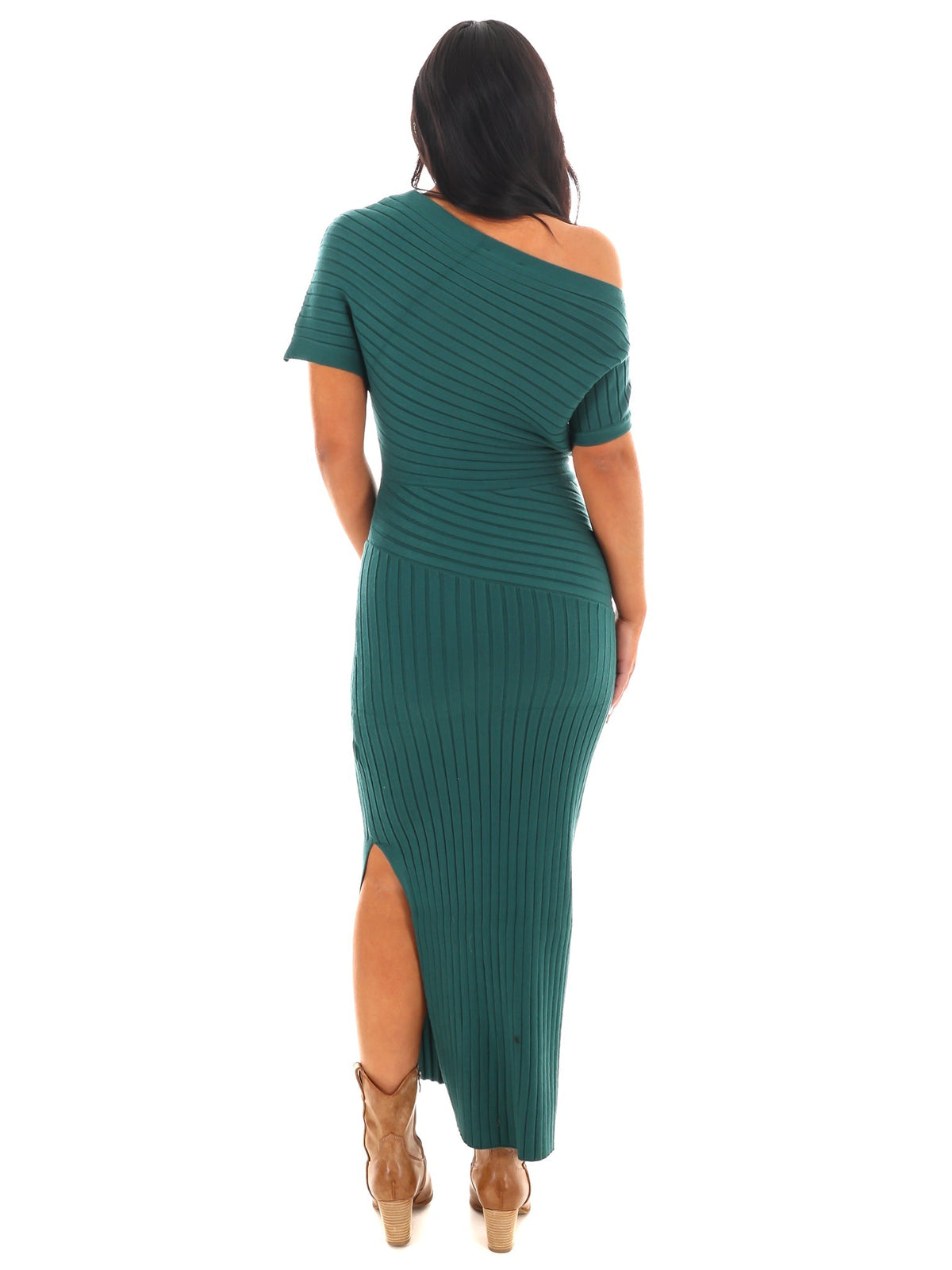 Step out in style with this Crisp Casual Ribbed Midi Dress. Featuring a trendy one side off shoulder design and a side slit detail, this solid ribbed knit dress is perfect for any occasion. Show off your unique fashion sense with this must-have dress!
