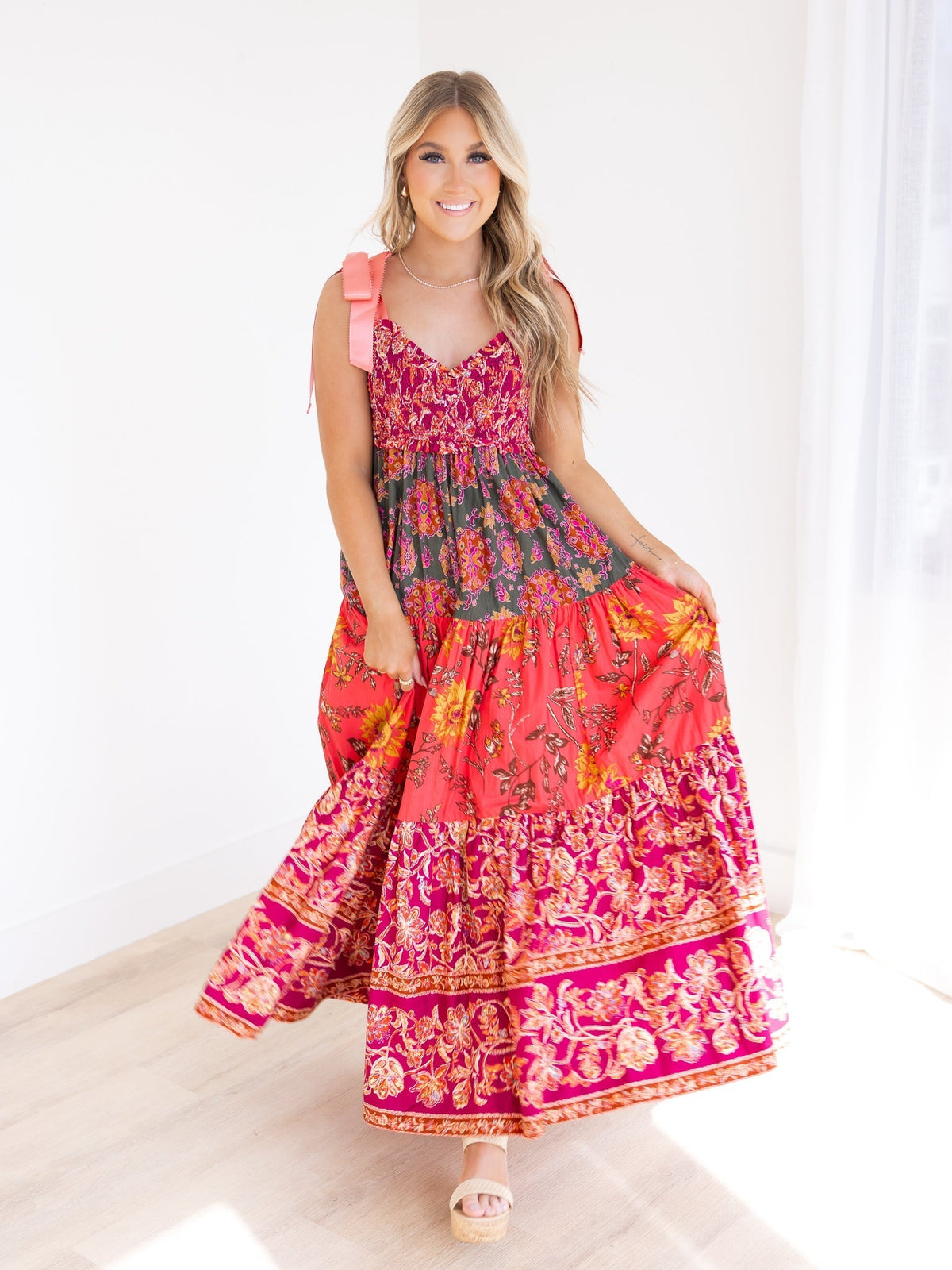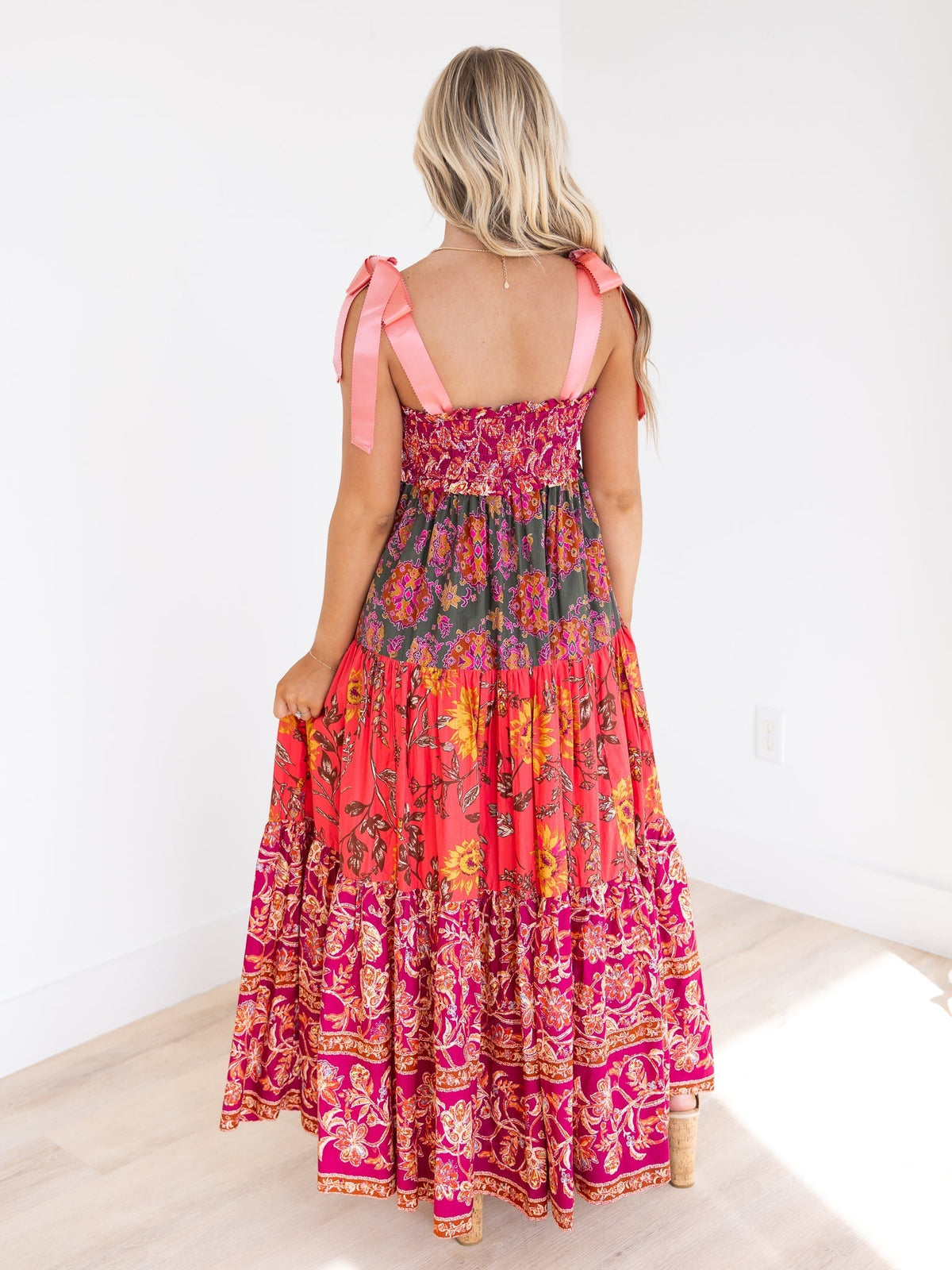 Printed to perfection in a forever femme floral print, this stunning maxi dress features a smocked bust with tiered bottom skirt and exaggerated shoulder ties for an added sweet touch.