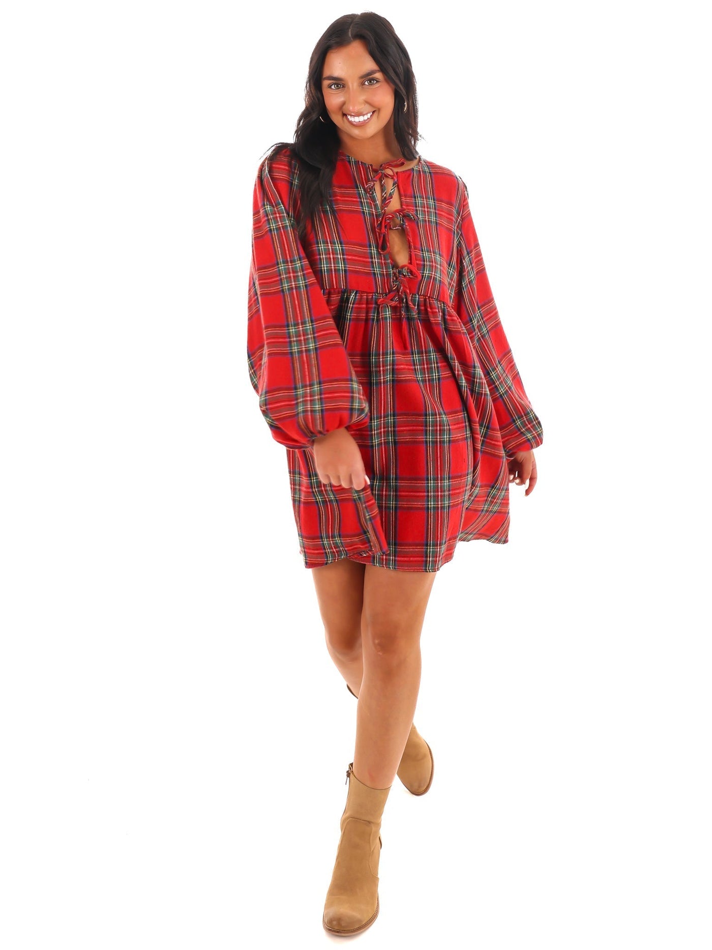 Get ready to sleigh this holiday season with our All Is Calm Plaid Mini Dress! This festive dress features a checkered plaid pattern, a front tie, and a round neck for a playful and stylish look. With shirred detailing, this dress will accentuate your figure and bring the holiday cheer to any occasion.