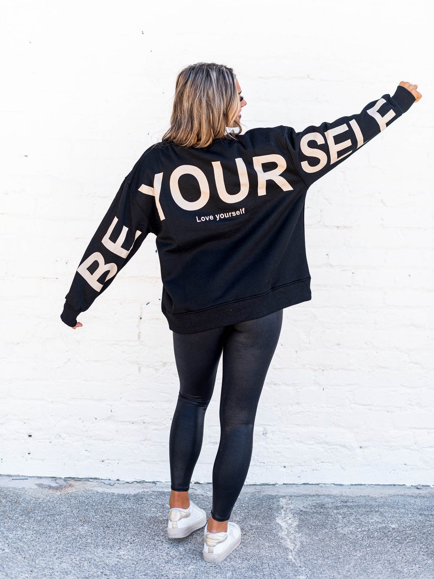 Don't want to blend in? Stand out in this comfy crew neck sweatshirt! Made with oversized drop shoulders, featuring a statement-making "Be Yourself Love Yourself" printed on the back - perfect for anyone looking to show off their individuality with style!