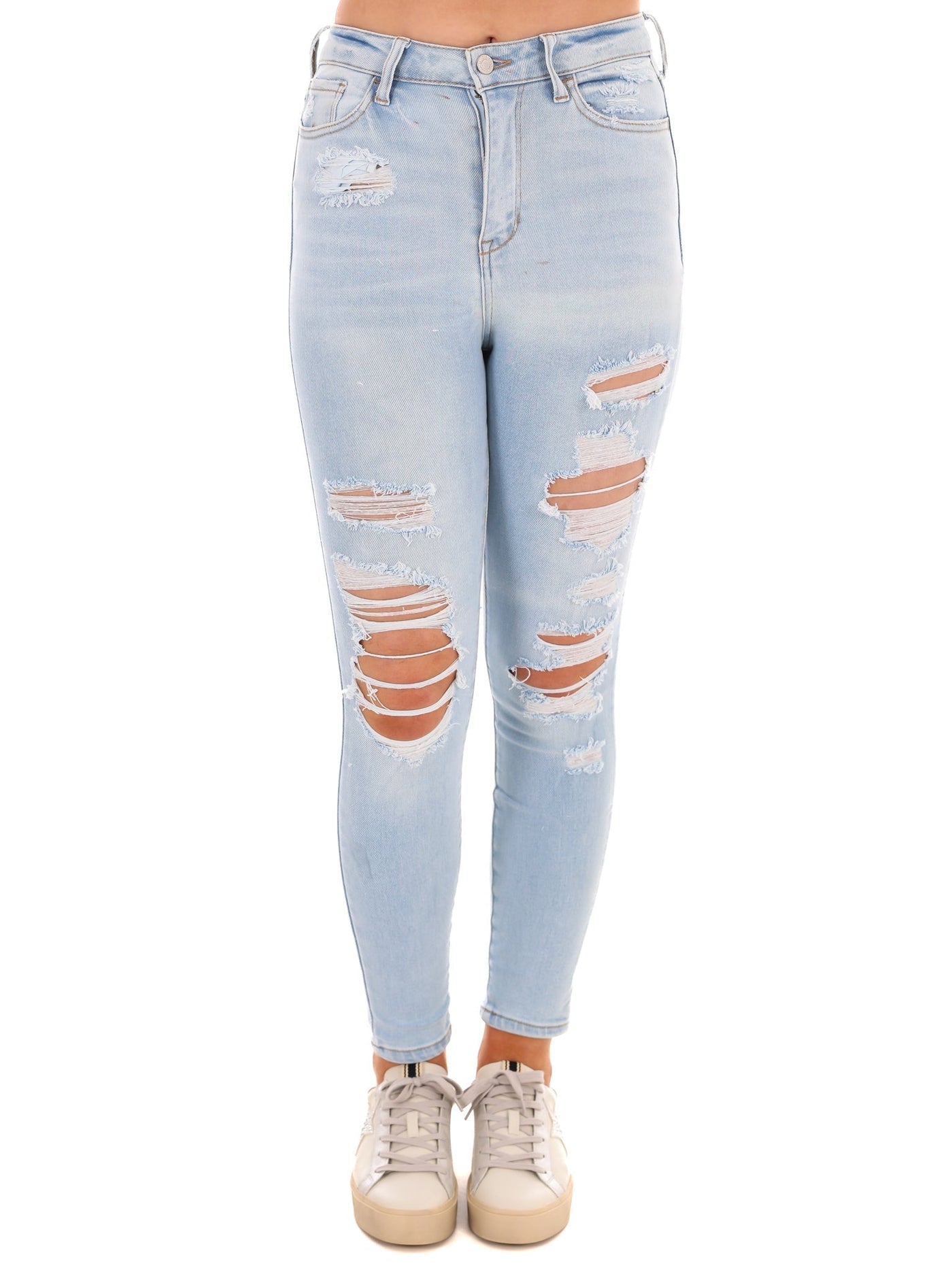 Love distressed jeans? We've got you covered! Featuring a high rise fit with a lot of distressed details, these jeans are a must have!