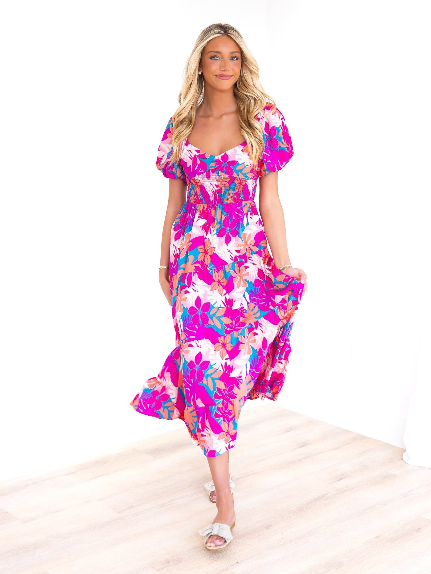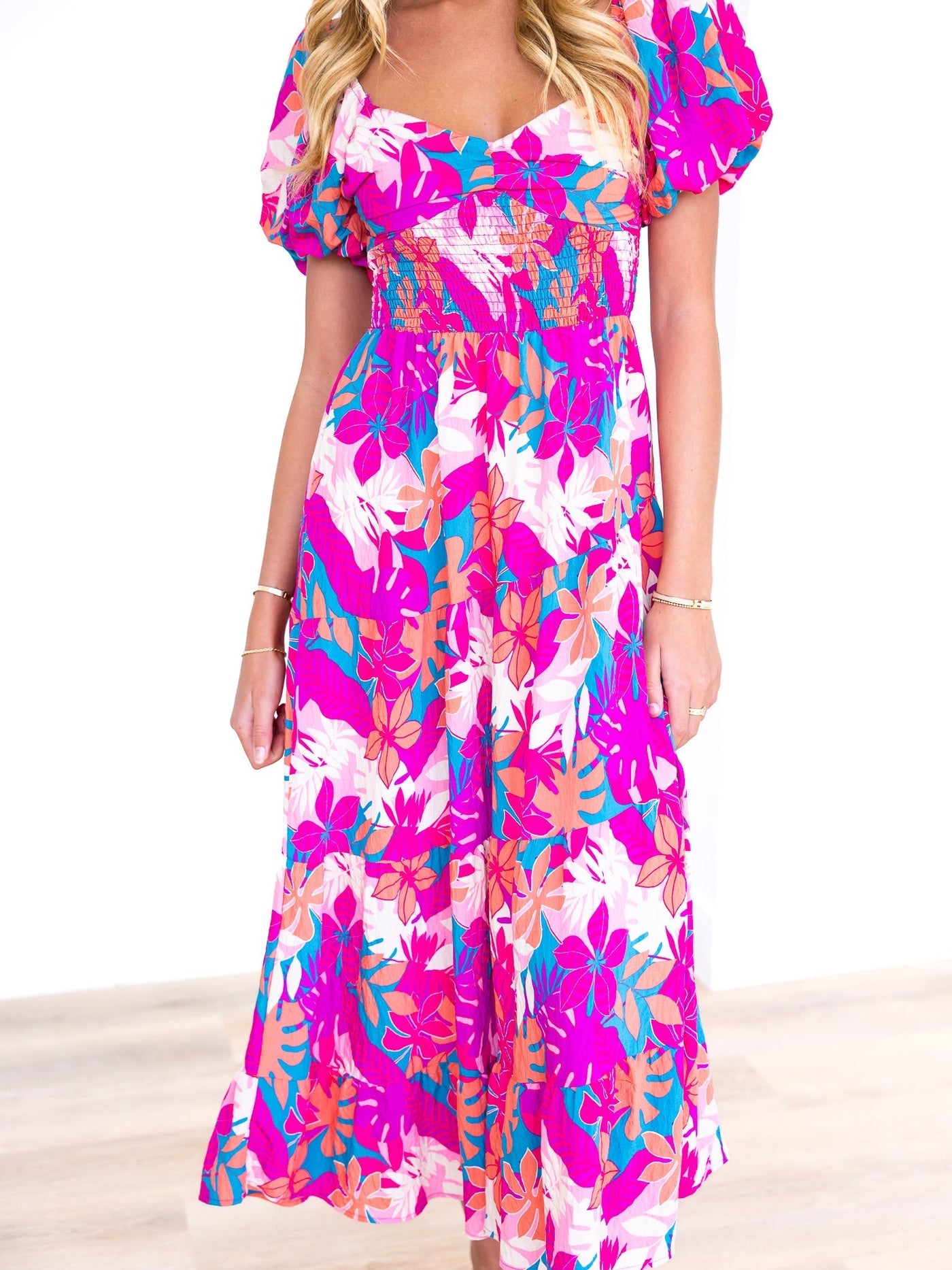 Get ready to celebrate in style with our Celebration Print Maxi Dress! This playful and fun dress features a v-neckline and short balloon sleeves, adding a touch of whimsy. The smocked waistband provides a flattering fit, while the tiered hemline and colorful tropical print add a touch of quirkiness. Perfect for any festive occasion!