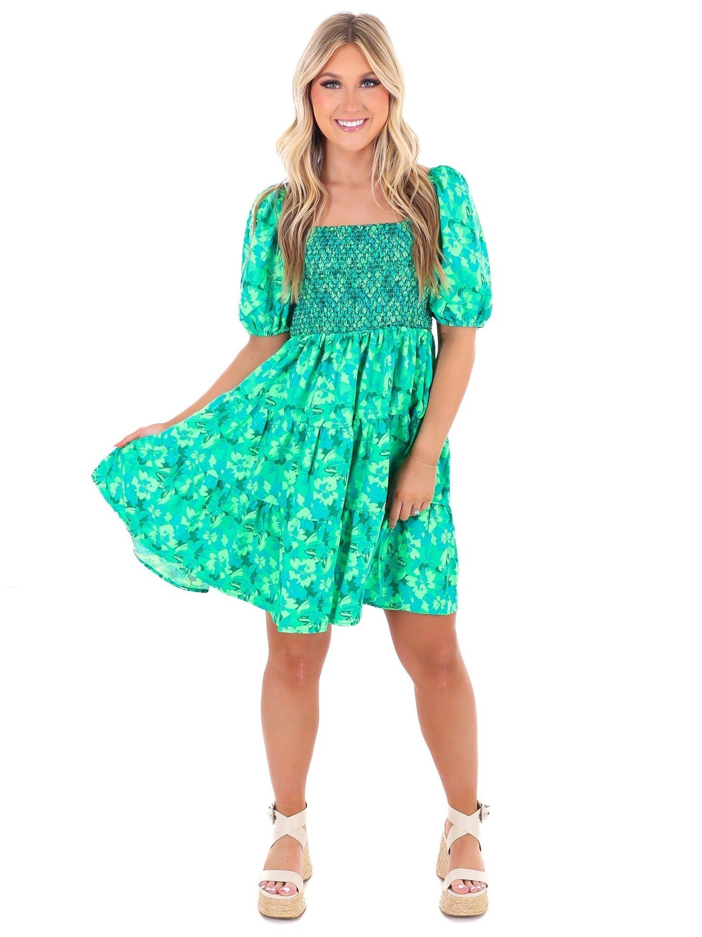 Chase her floral dreams in this satin mini dress, featuring a square neckline and smocked front for a flattering fit. Bubble sleeves and a tiered, ruched bottom add a playful touch, while pockets and a loose fit make it easy to wear. Simply pull over and let the fun begin.