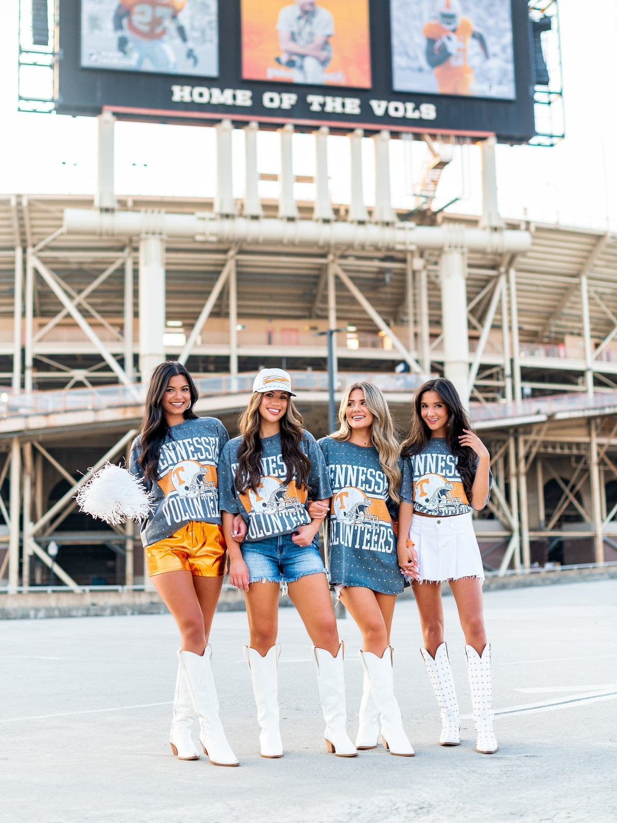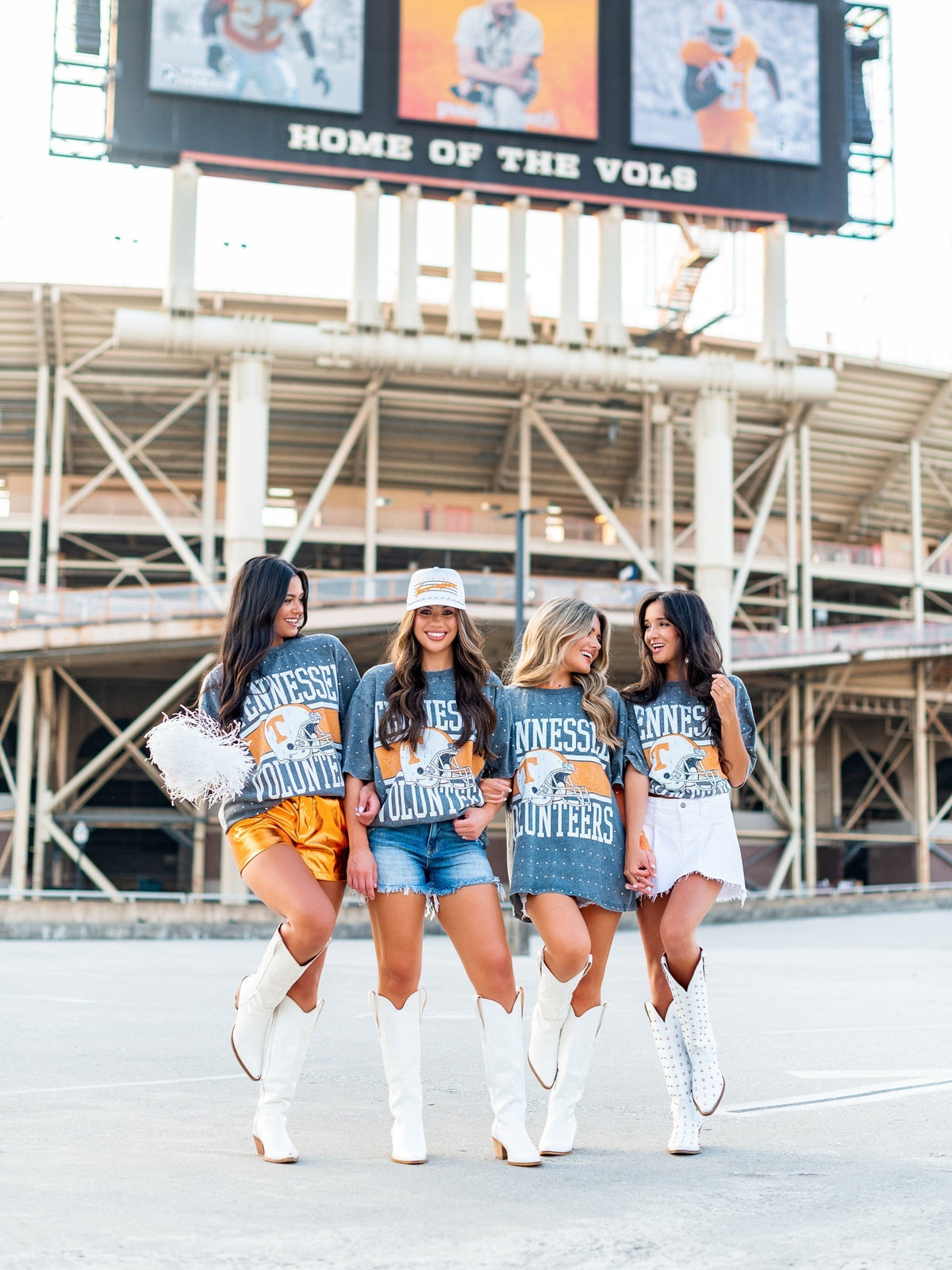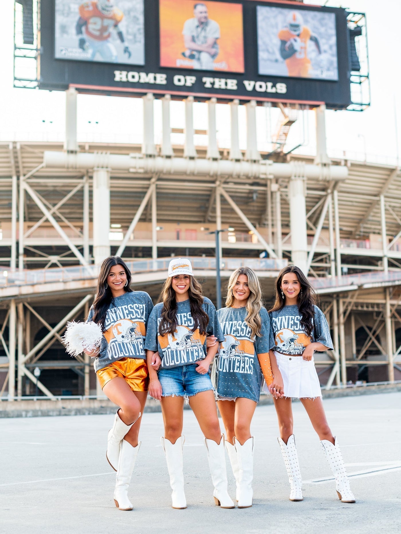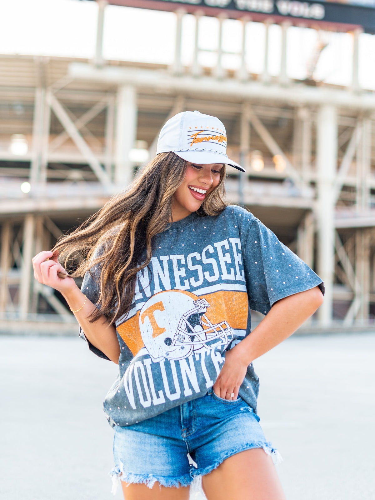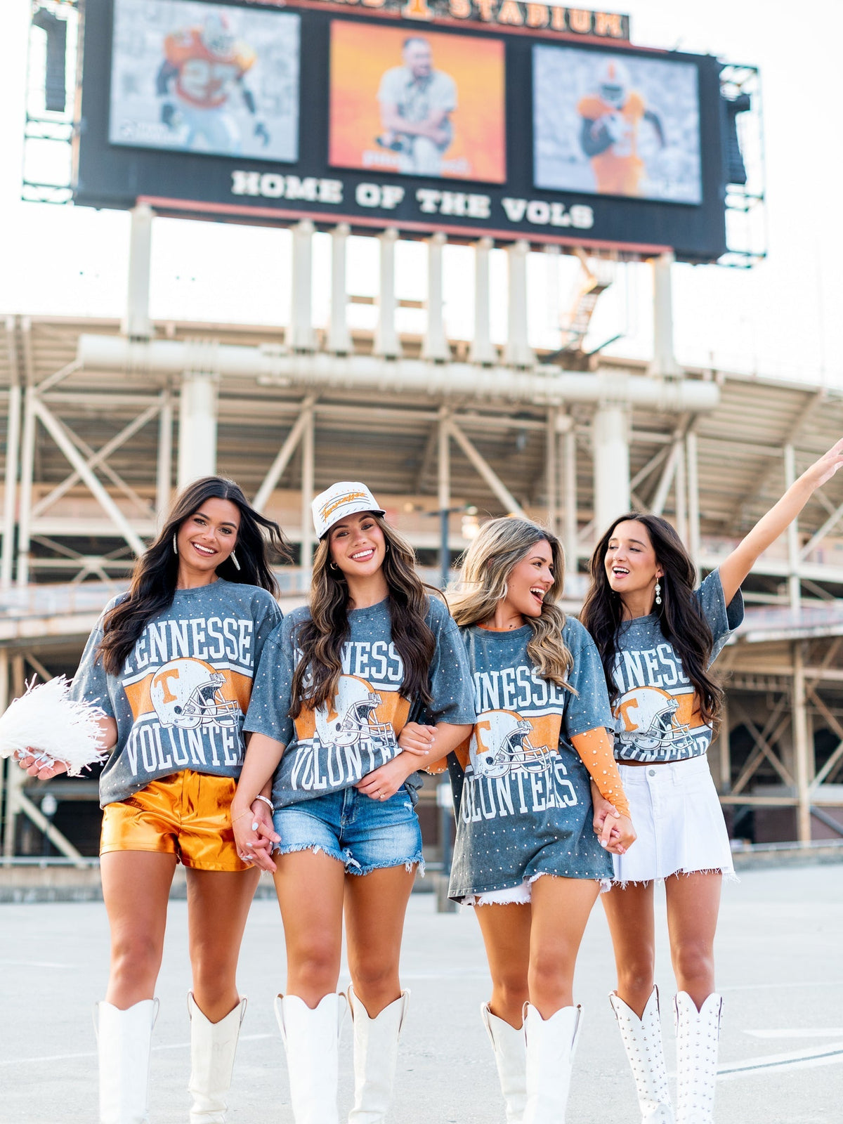 Stand out with this University of Tennessee Oversized All-Over Mini Rhinestone Tee! Featuring an all over rhinestone design of the Tennessee Volunteers helmet, this graphic tee is perfect for any fan looking to add some sparkle to their game day outfit. Game on!