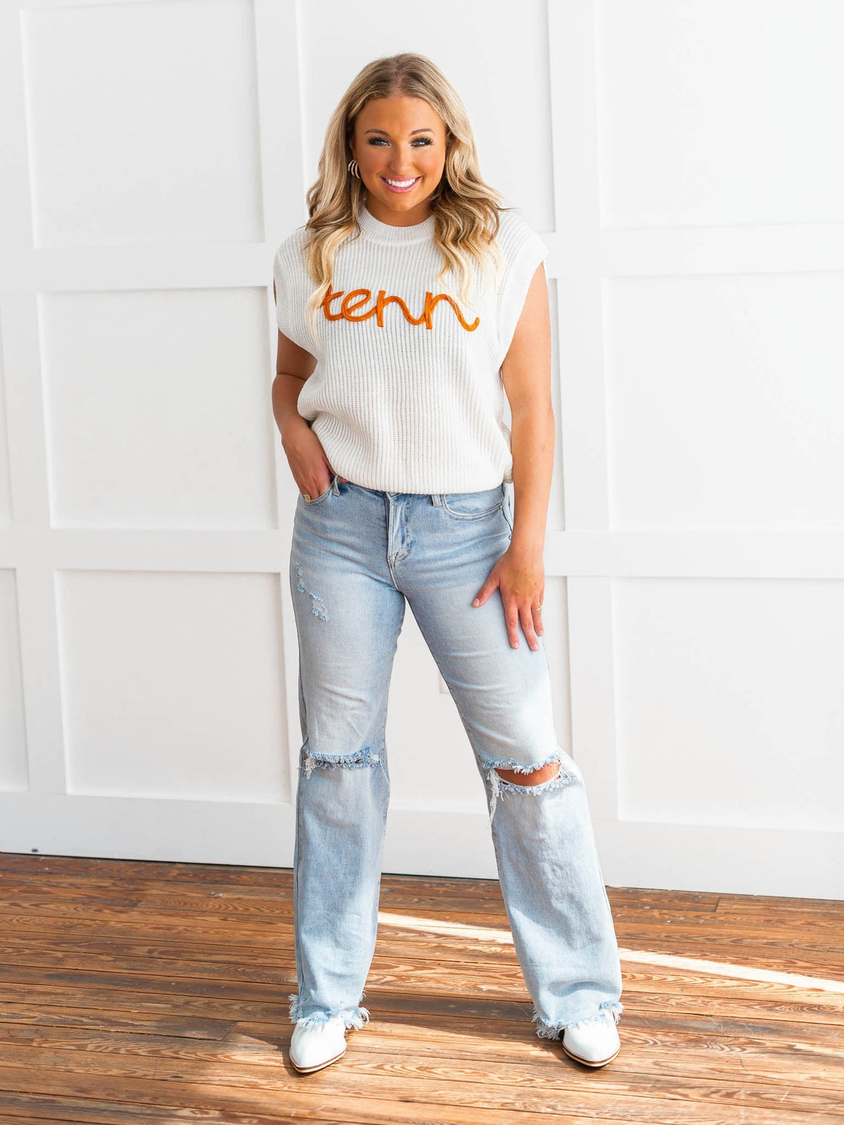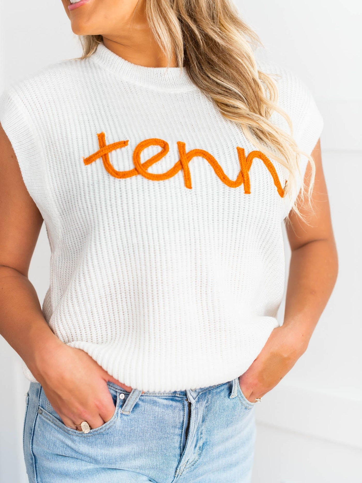 Put your Tennessee pride front and center with this perfectly preppy Tenn Embroidered Sweater Top! This comfy vest features 'Tenn' embroidered in Tennessee Orange on an Ivory background for a subtle yet stylish show of school spirit. Go Vols!