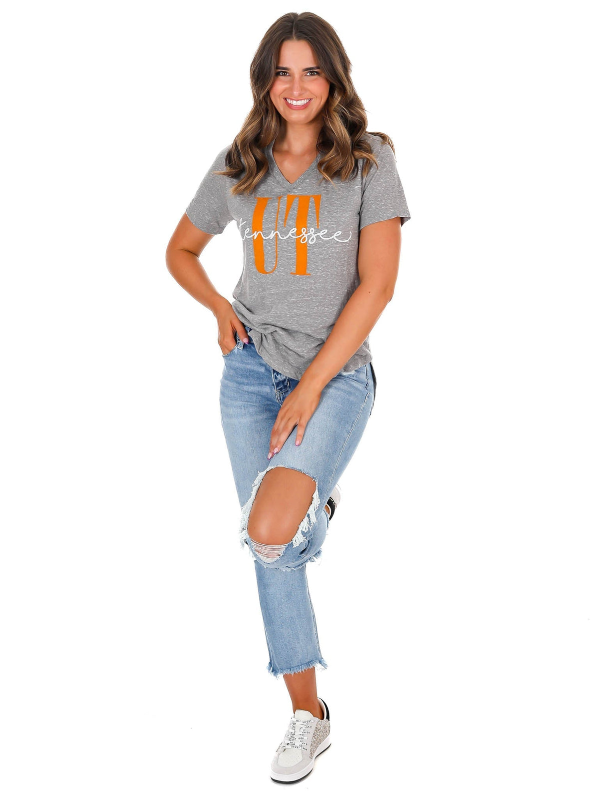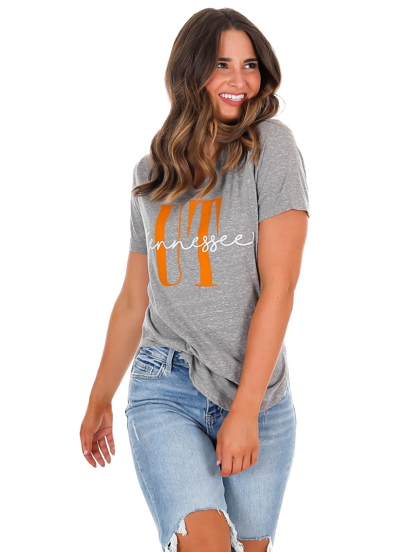 Look your UT best with this Tennessee Coral Rounded Bottom Top! Show off your Vols spirit with the official UT graphics on the v-neckline, and have fun with style with the rounded hemline. It's a win-win combo of fashion and fandom! Go Vols!!