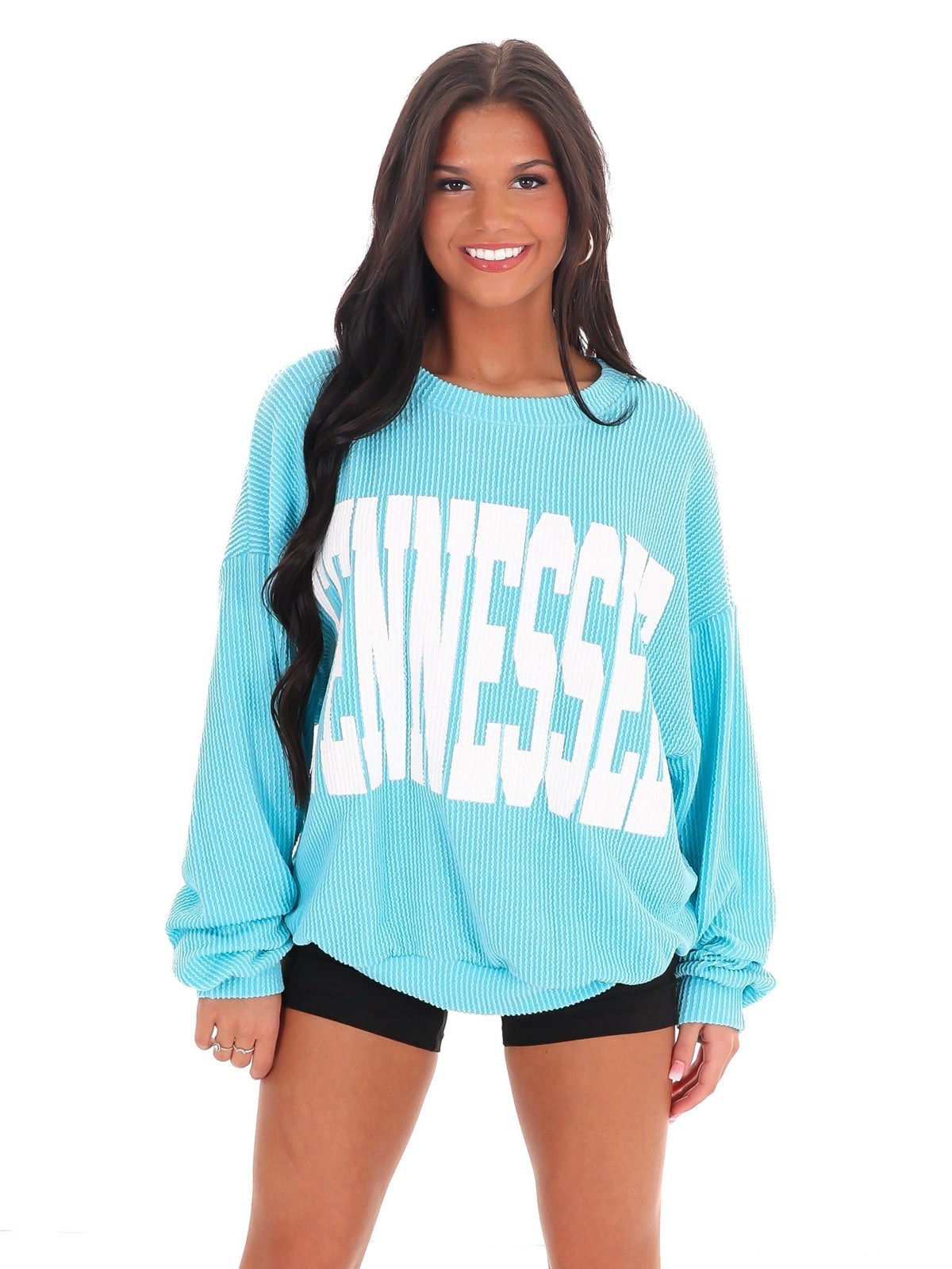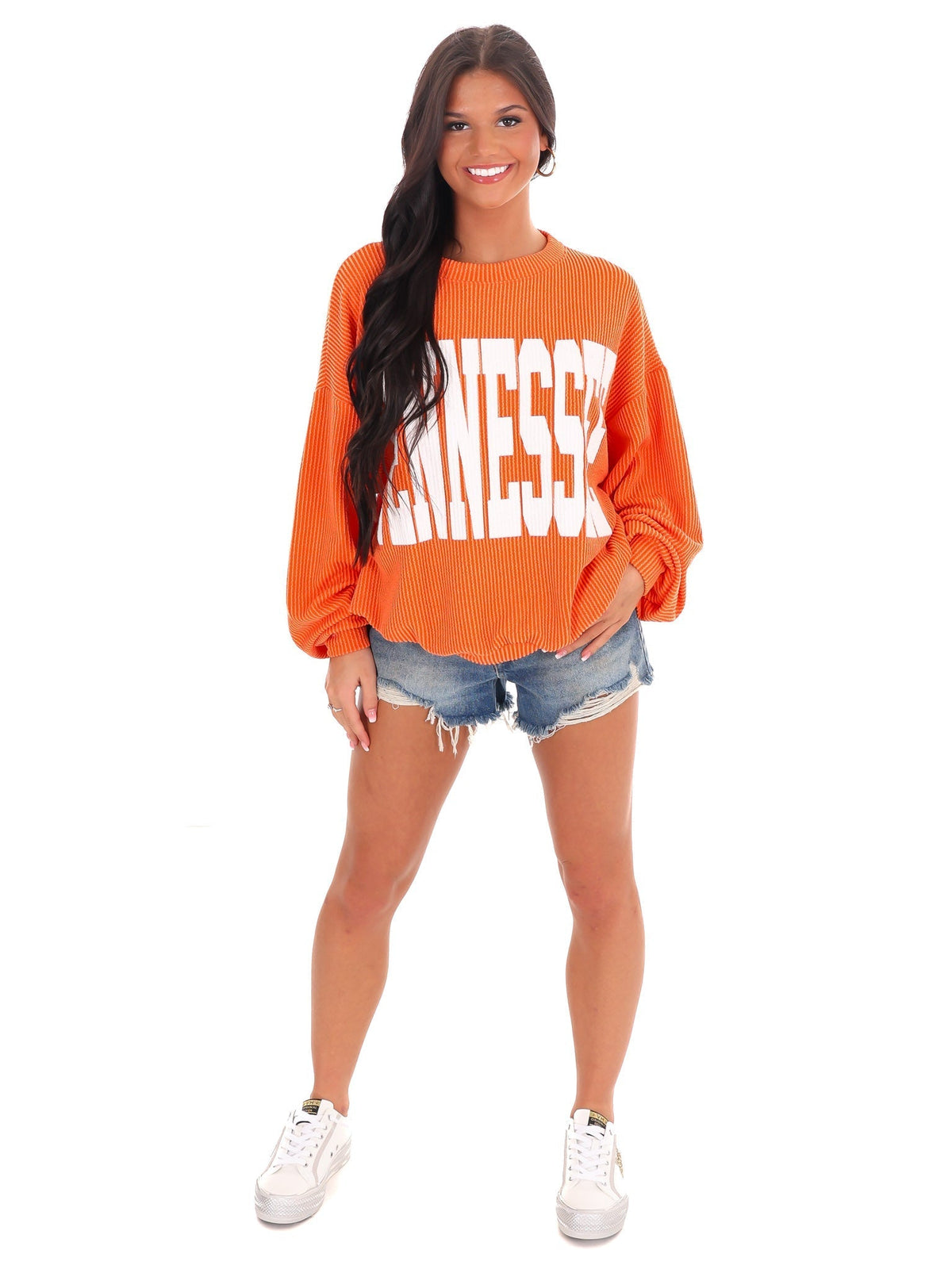 Get comfy and cozy with this Tennessee Ribbed Oversized Pullover! With a crew neck and long drop-shoulder sleeves, this pullover is perfect for lounging around or running errands. Made from corded fabric, it's not only stylish but super comfortable. Stay warm and show off your Tennessee pride with this oversized graphic sweatshirt.