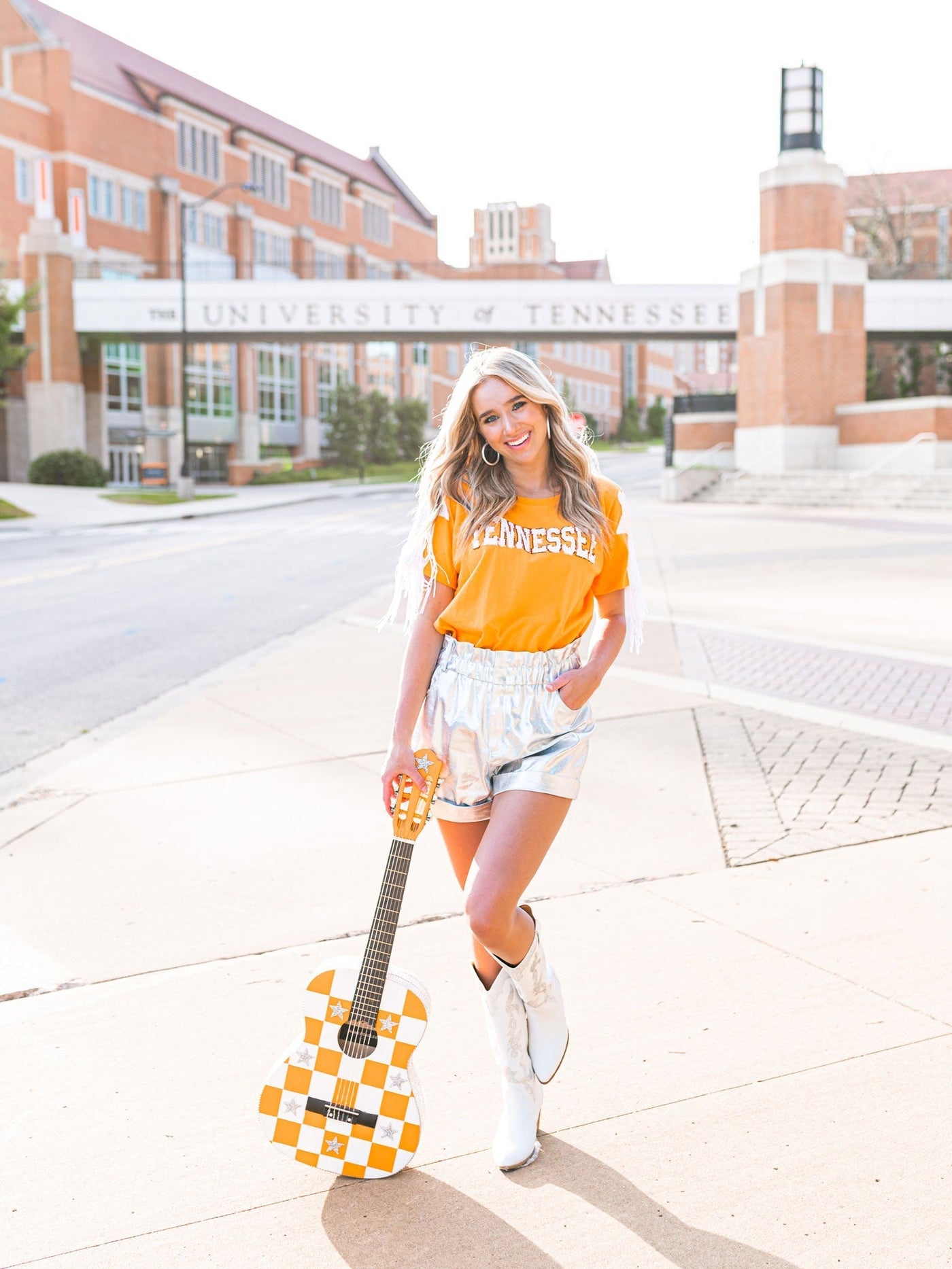Score big with the Tennessee Stars & Fringe Tee! This comfy round neck tee is decked out with sequin Tennessee lettering, plus sparkly stars and fringe on the sleeves for the perfect touch of school spirit on game day. High low hemline ensures you get the perfect amount of coverage without sacrificing style. Go Vols!