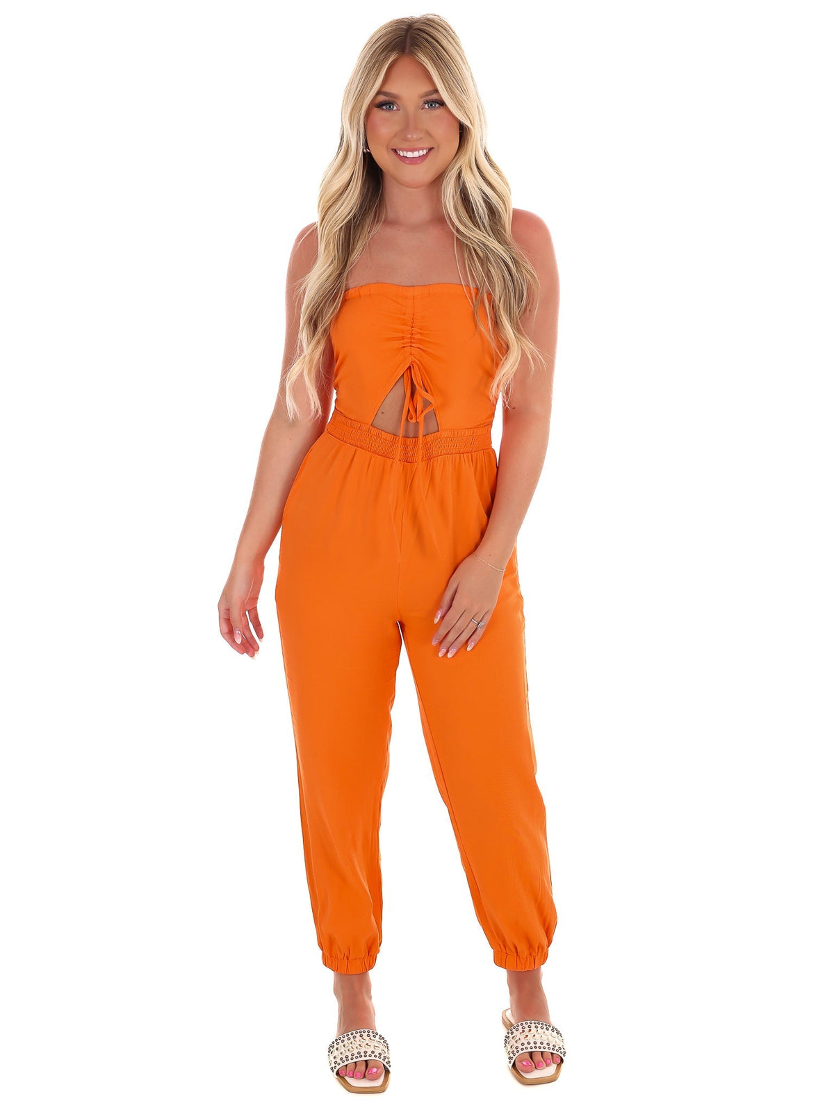 Elevate your game day look with the Tennessee Triumph Strapless Jumpsuit. This sleeveless jumper features a front cut and jogger pants for a trendy twist. Get ready to stand out in this strapless, must-have piece from our Tennessee Gameday Collection!