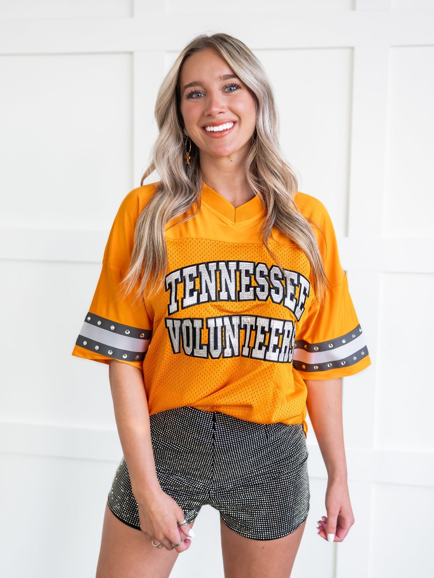 Be the MVP in this oversized fashion jersey featuring rhinestone details on the sleeves and a rhinestone Tennessee Volunteers logo. Show off your team spirit in style and get ready to make a statement on game day!
