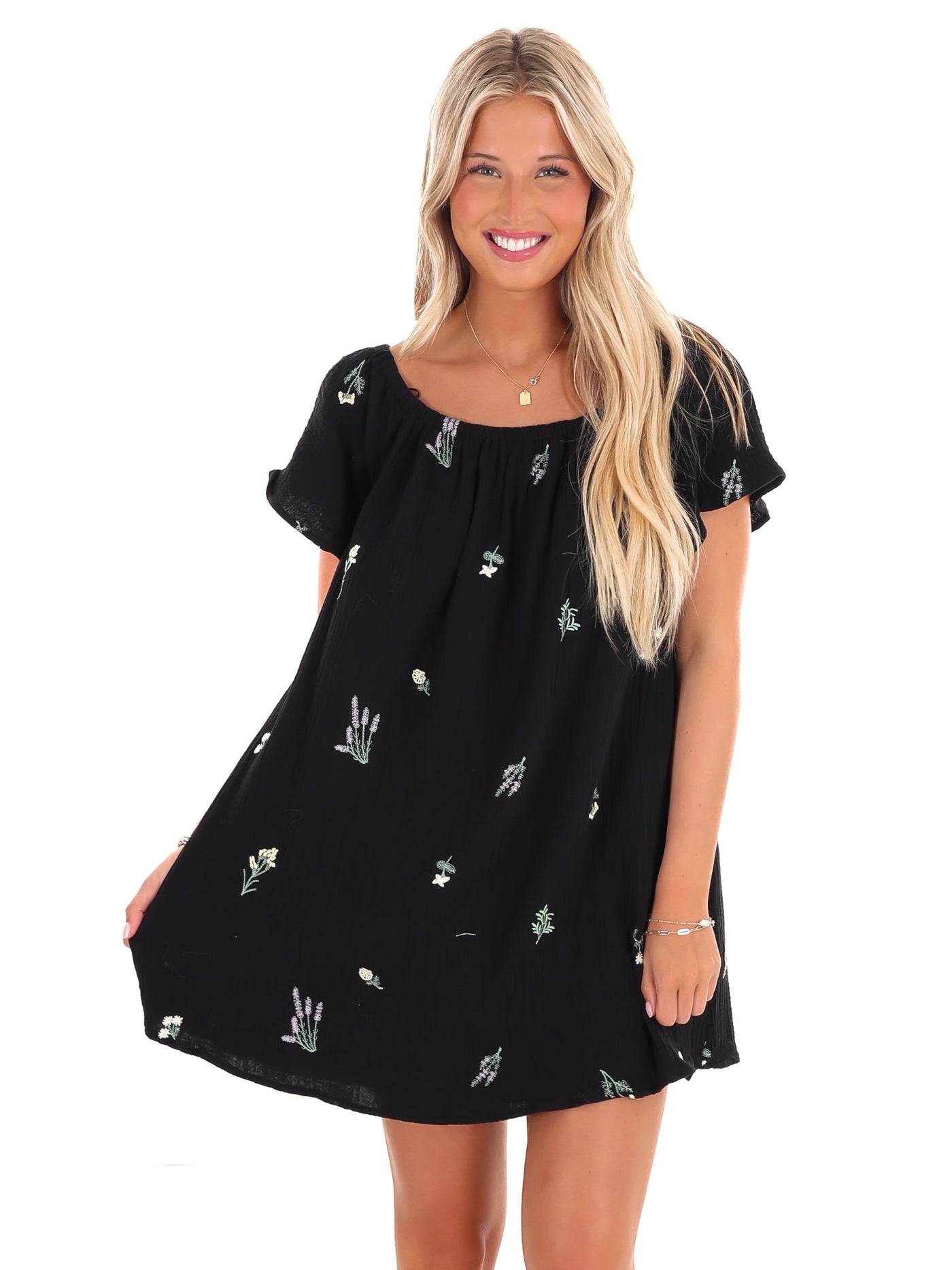 Unleash your inner flower child with our That Thing You Do Floral Dress. This off shoulder dress features delicate floral embroidery on lightweight cotton gauze material, making it the perfect dress for sunny days. Feel free to twirl and dance in this flirty dress!