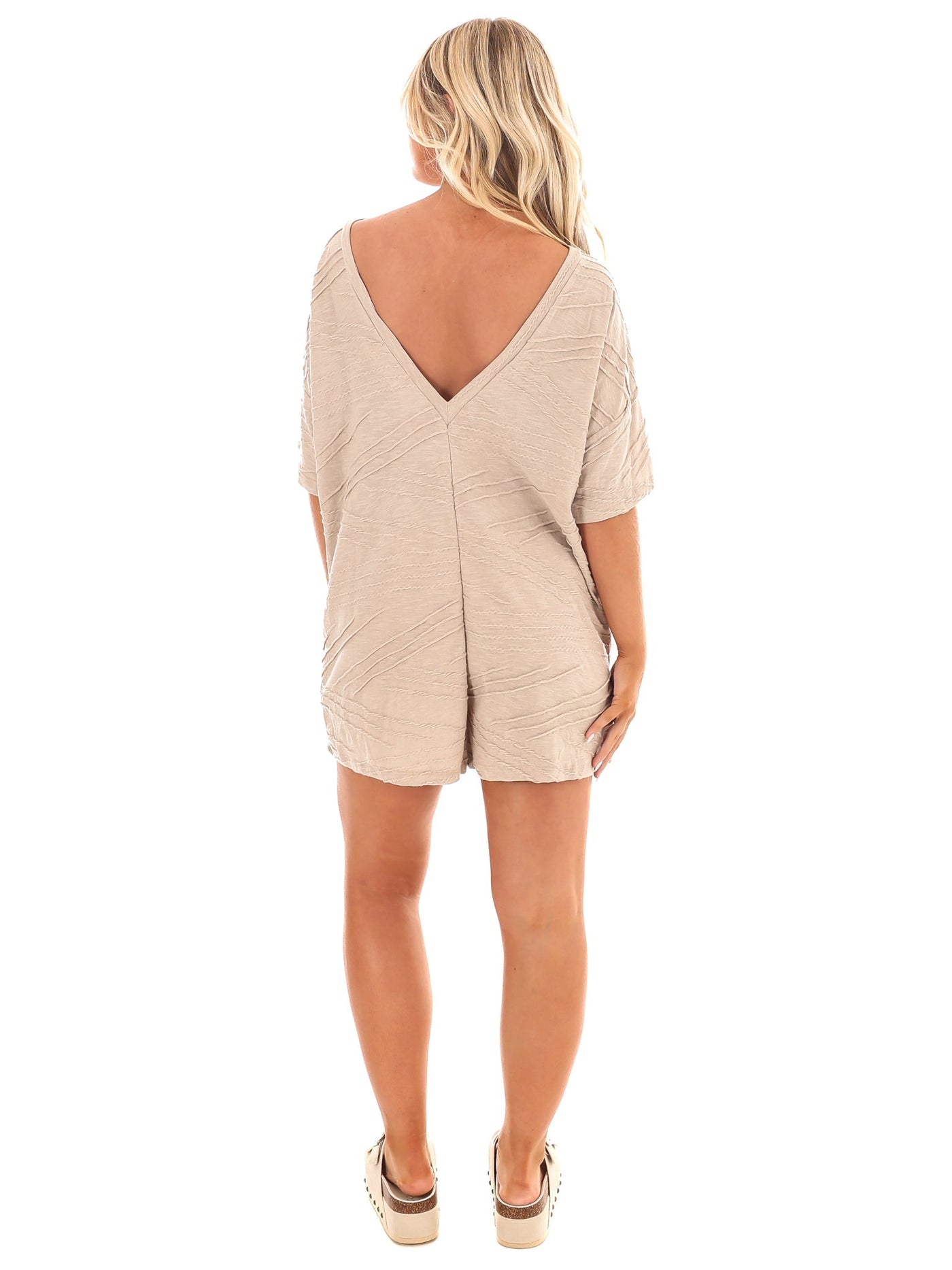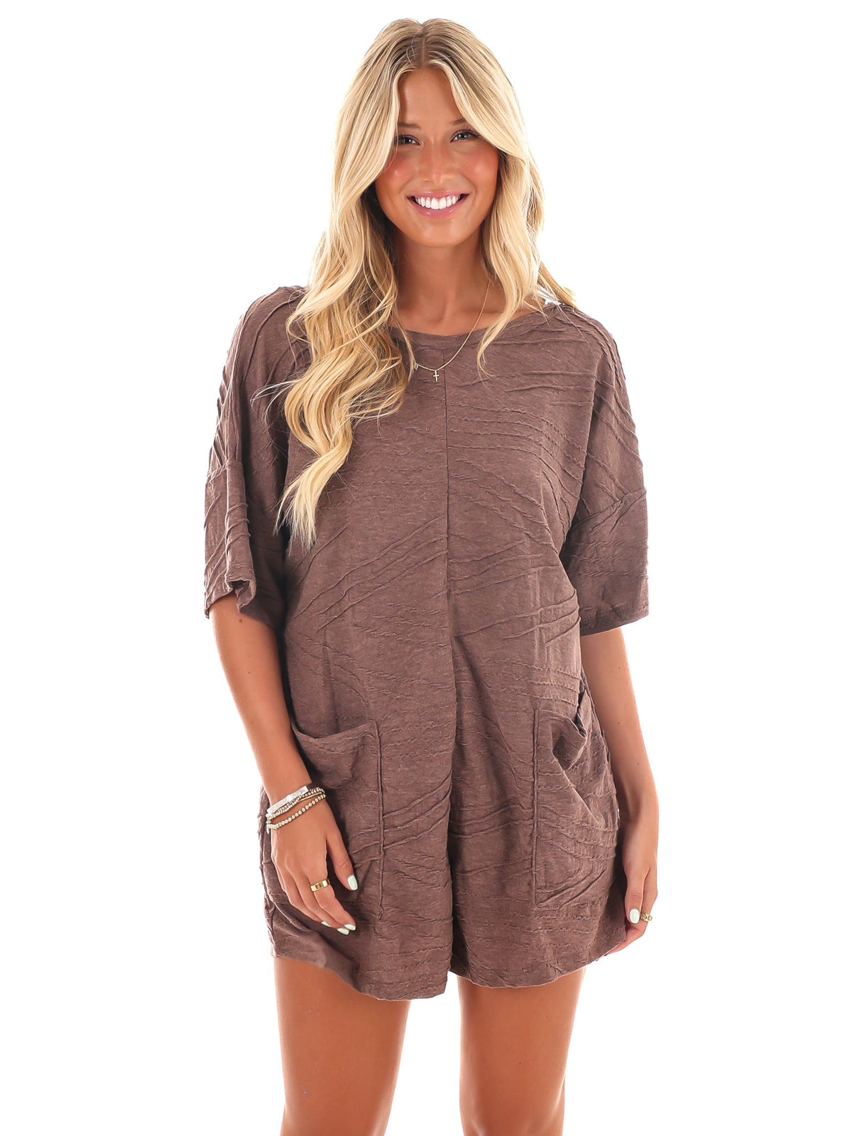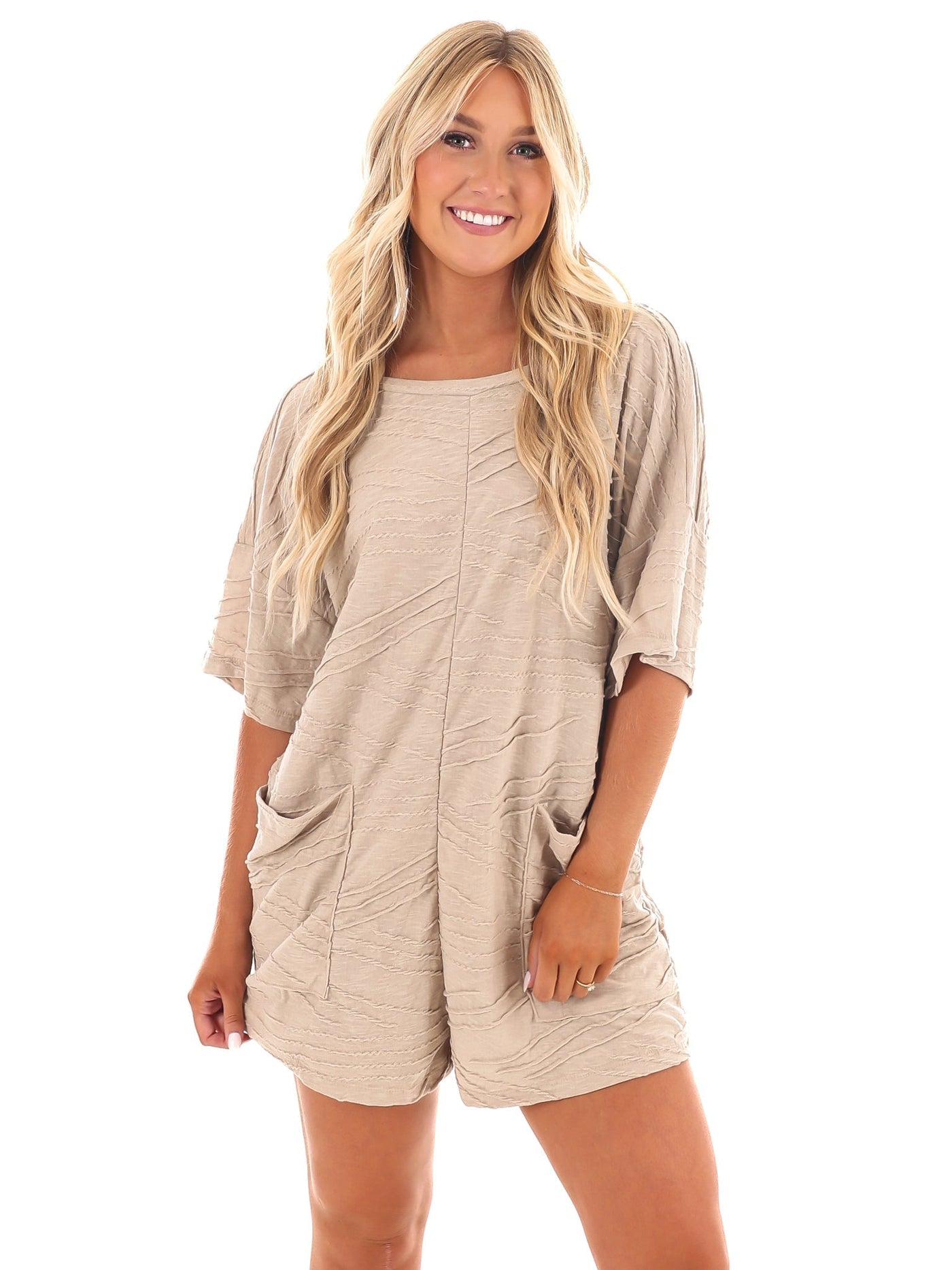 Get ready for a change in your wardrobe with our Time for Change Oversized Textured Romper! Made from textured solid cotton/poly fabric, this romper features a crew neckline, half-length sleeves, and a drop shoulder for a relaxed look. Complete with front pockets and a v-line back, this oversized silhouette will keep you stylishly comfortable all day long.