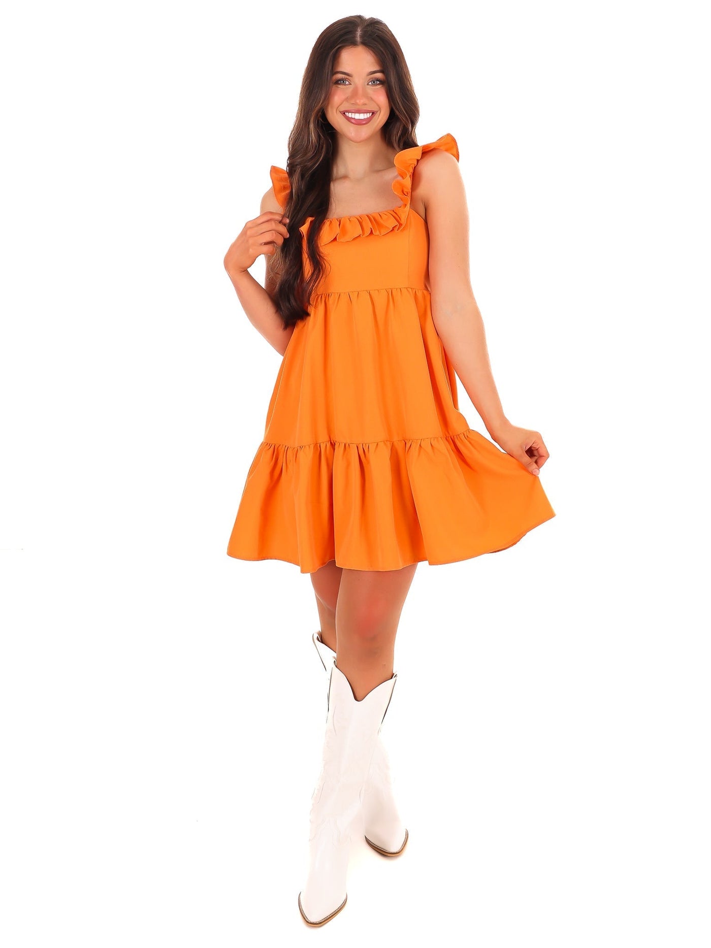 Unleash your sporty side with the Touchdown Throwdown Ruffle Mini Dress. Featuring a square neckline, smock back, and playful ruffle details, this mini dress is perfect for any occasion. Game on!