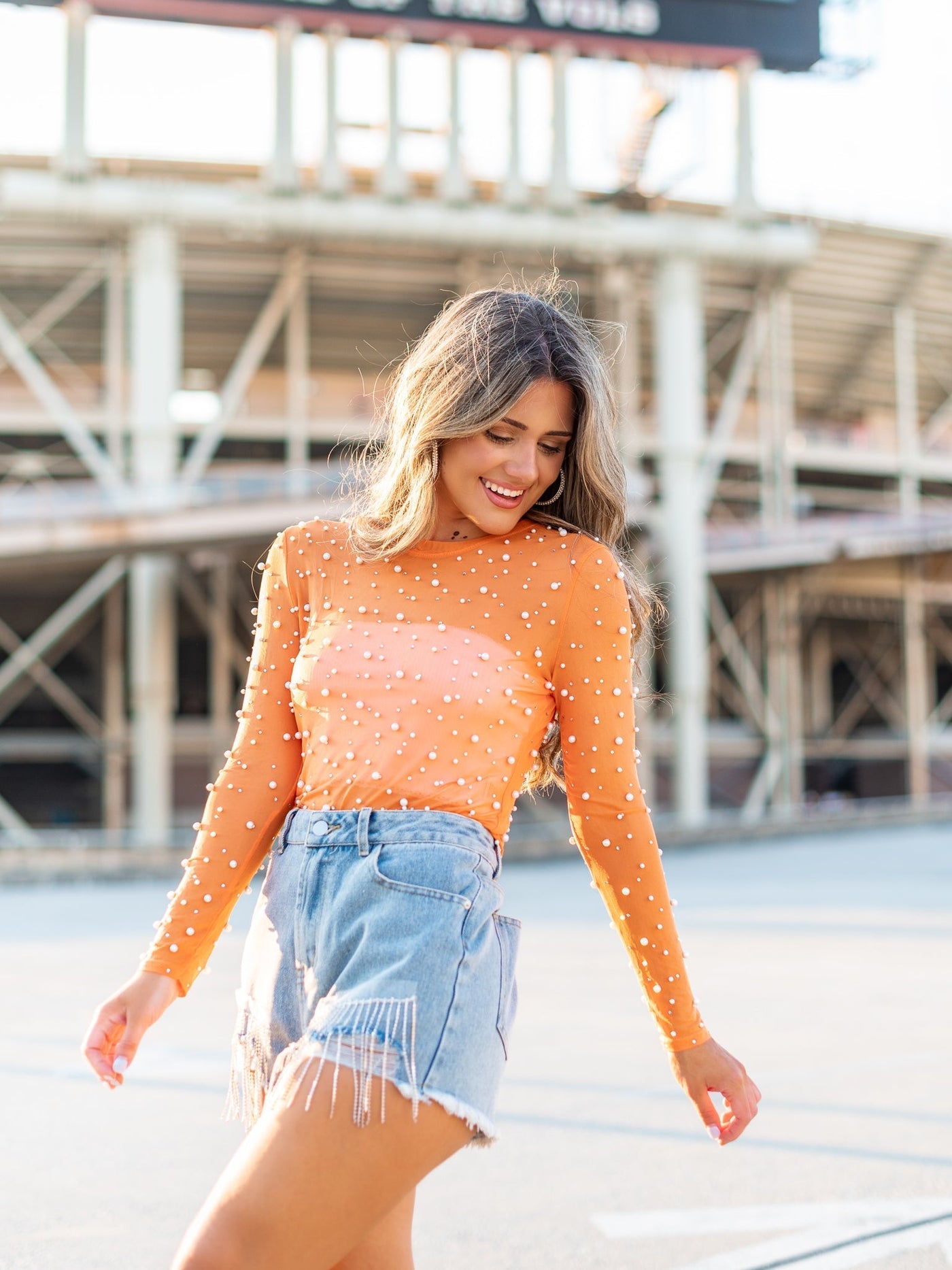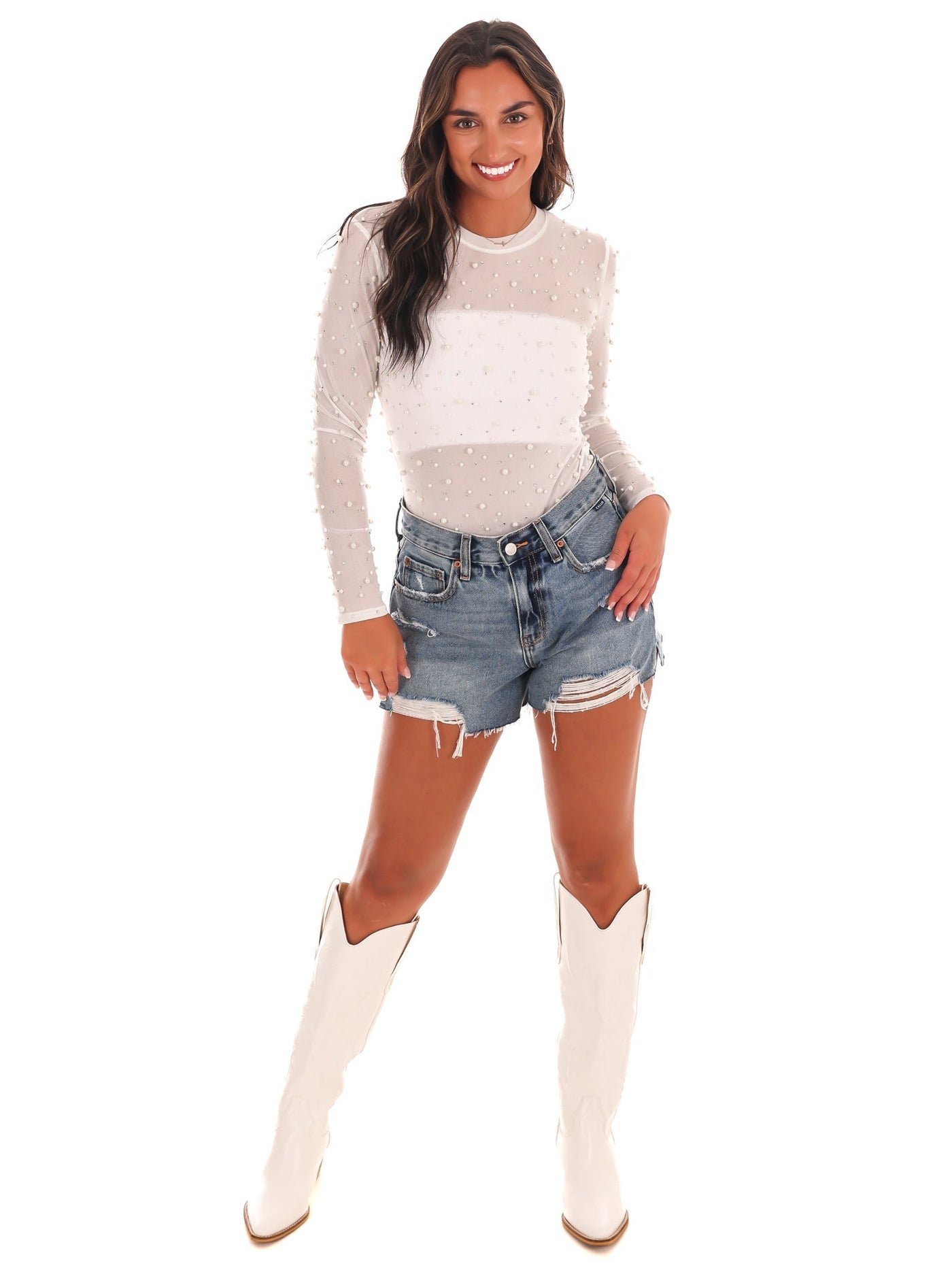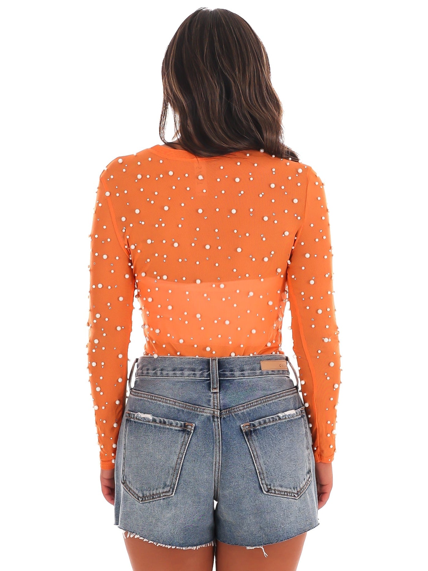 Unleash your inner glitz goddess with the UnbelieveaVOL Sheer Bodysuit! This shiny and sassy rhinestone and pearl sheer beauty is perfect for transforming any outfit- wear it alone with a pair of jeans for a bold look, or keep it casual and rock it under an oversized tee! (Cause who doesn't love glittery peeking out everywhere?) Shine on!