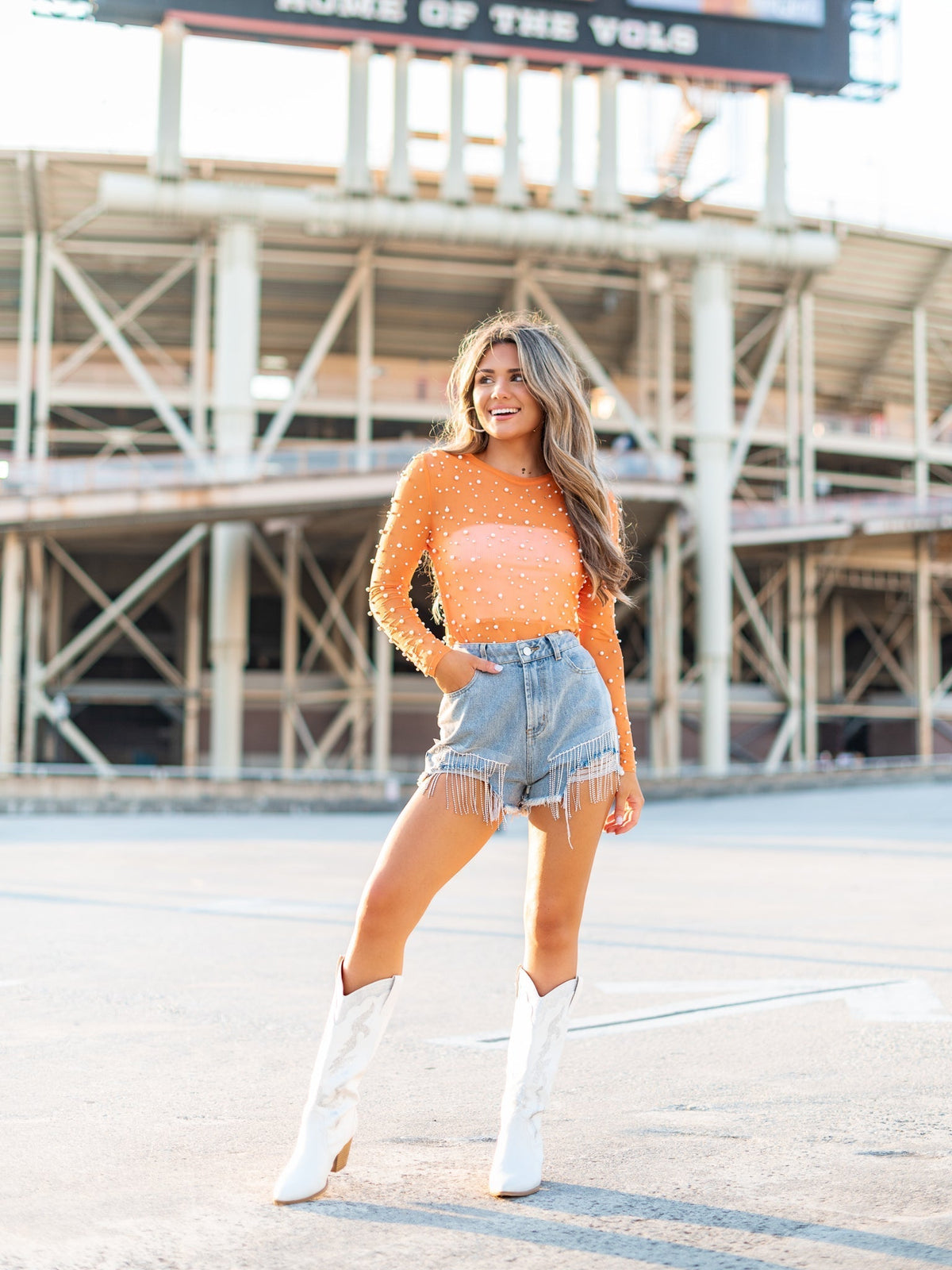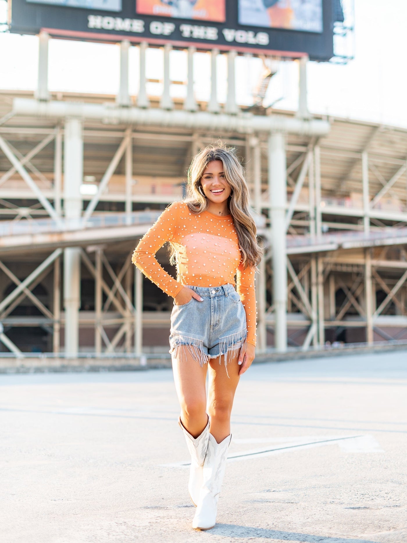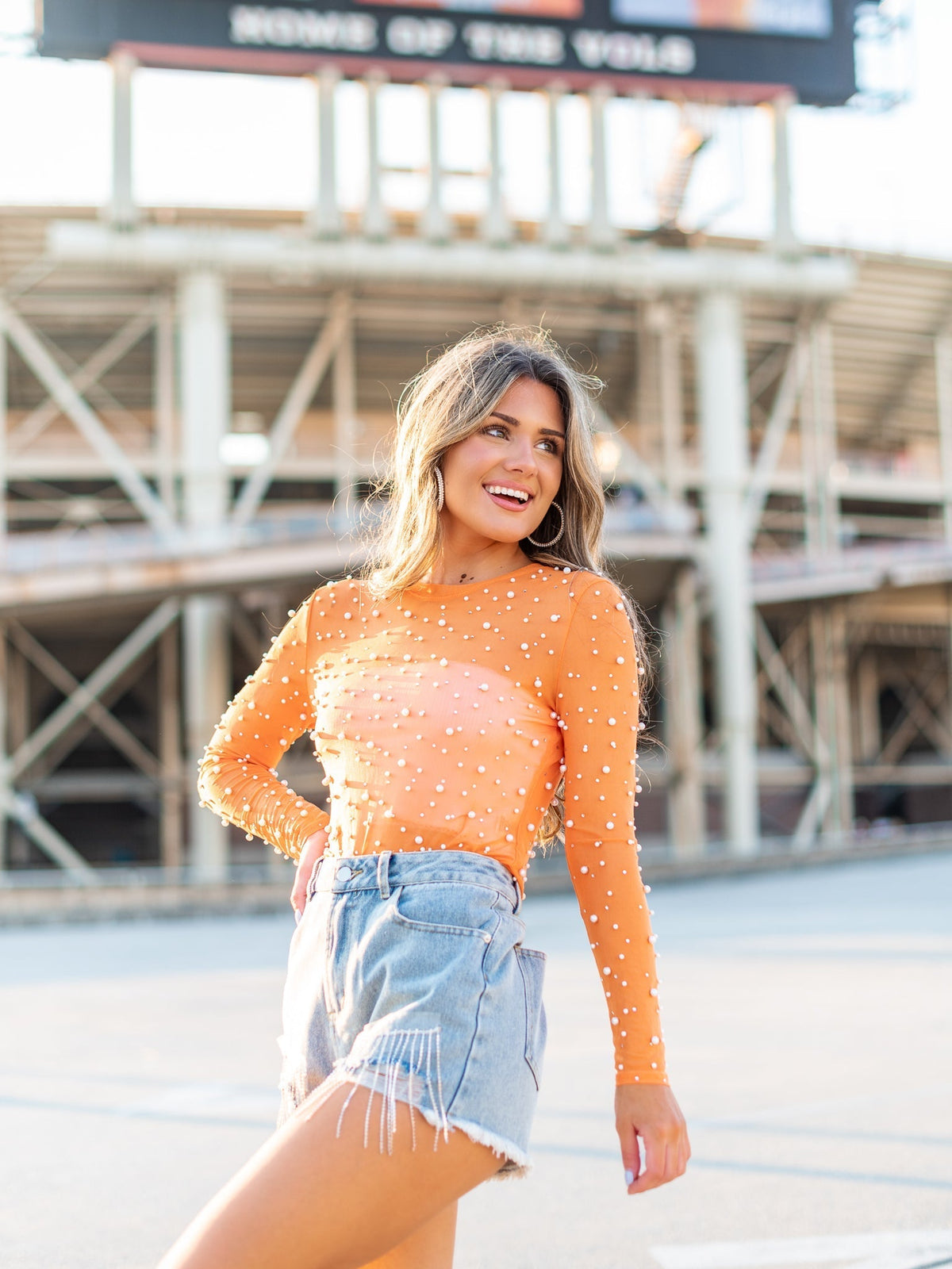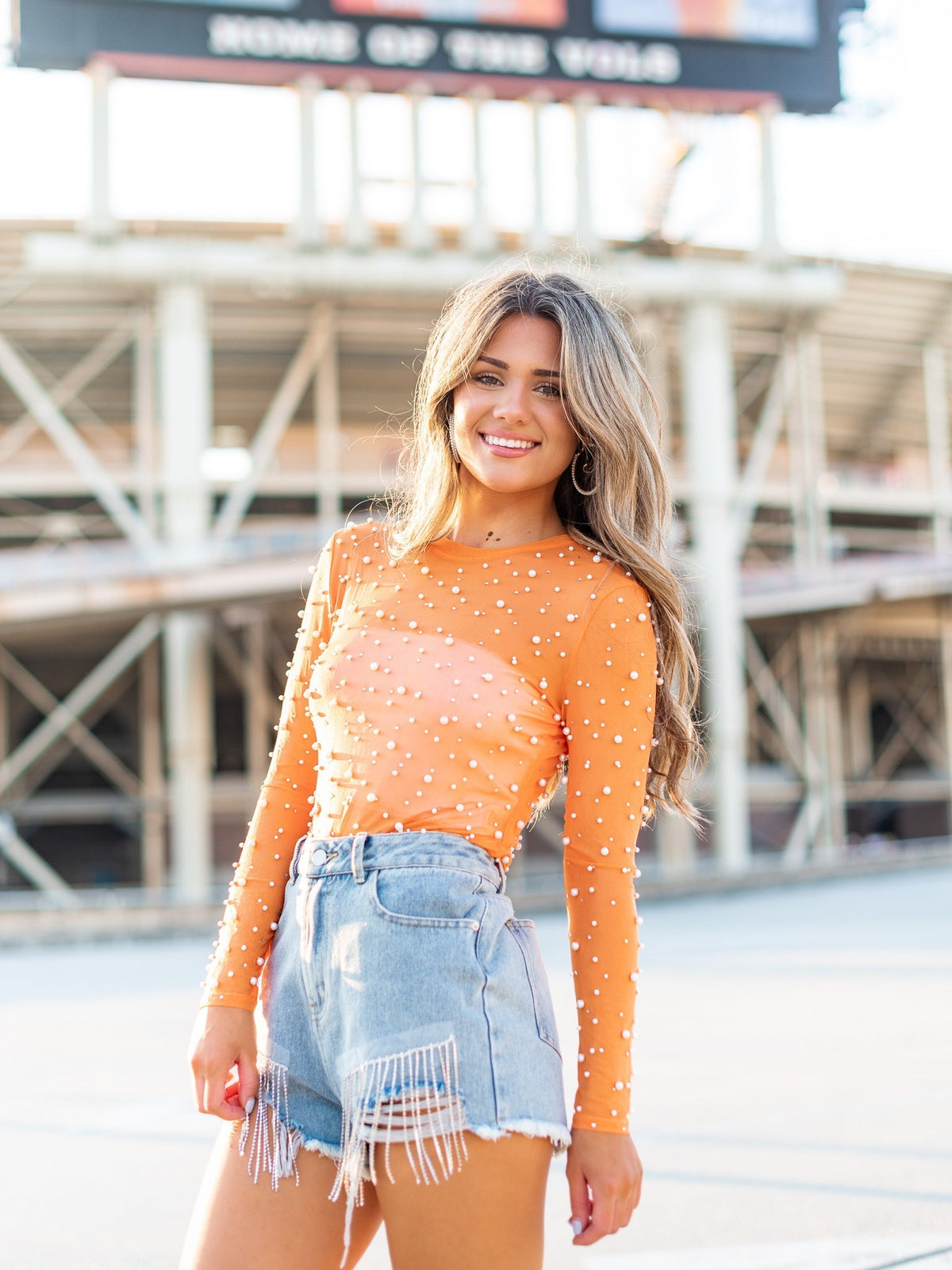 Unleash your inner glitz goddess with the UnbelieveaVOL Sheer Bodysuit! This shiny and sassy rhinestone and pearl sheer beauty is perfect for transforming any outfit- wear it alone with a pair of jeans for a bold look, or keep it casual and rock it under an oversized tee! (Cause who doesn't love glittery peeking out everywhere?) Shine on!