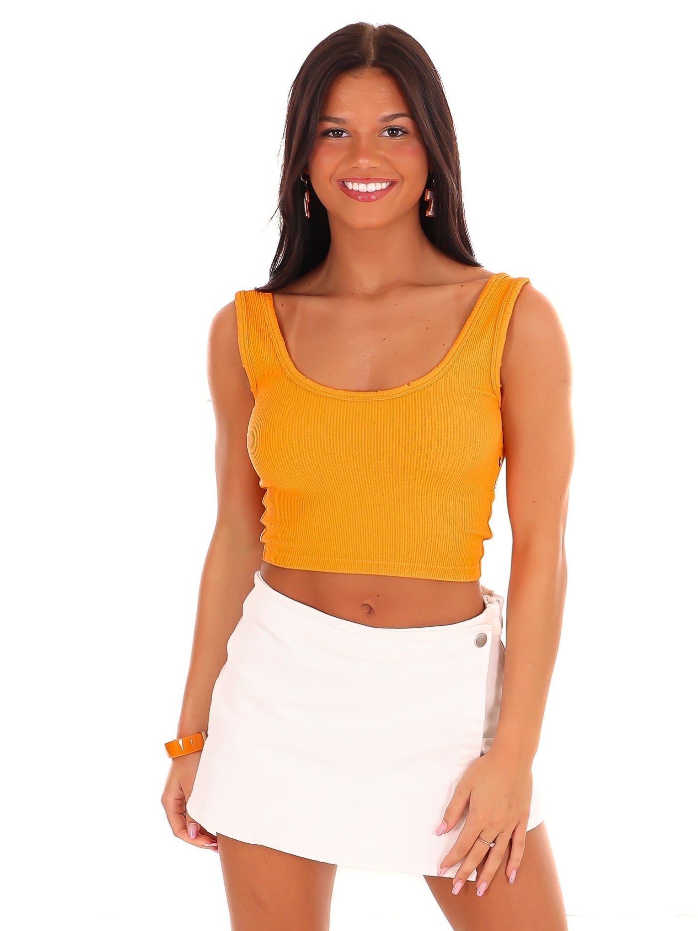 Unleash your inner "crop" star with this seamless tank top. With a scoop neckline and open back, this ribbed top adds a playful twist with side eyelet seams and unique side detail. Perfect for workouts or a casual day out.