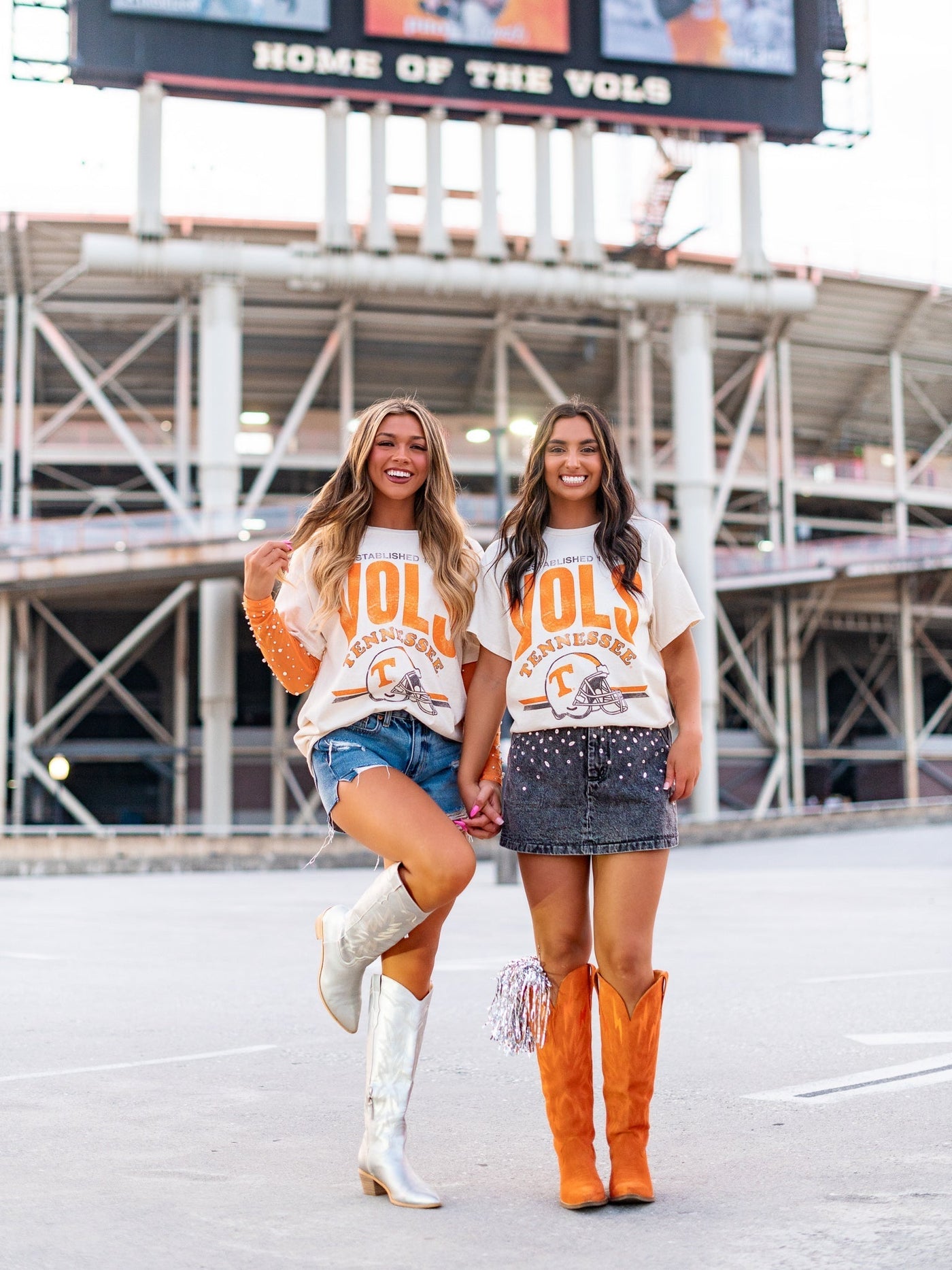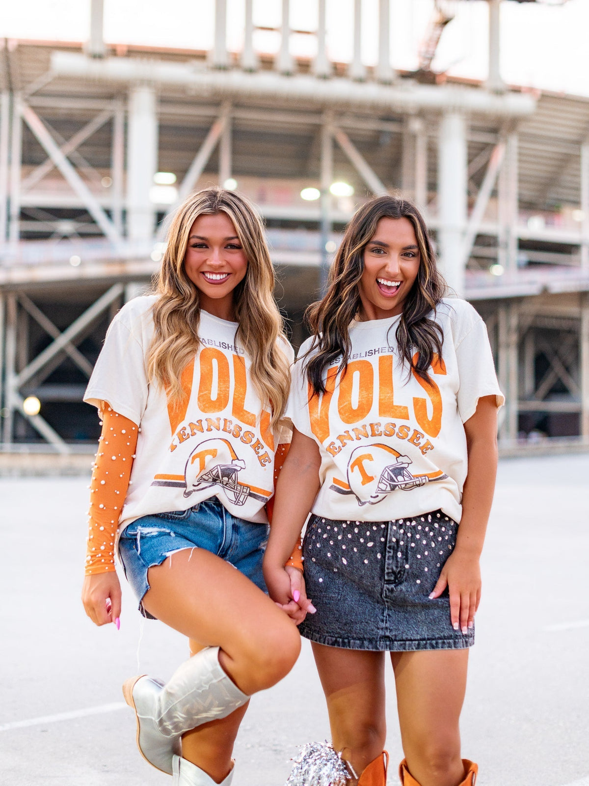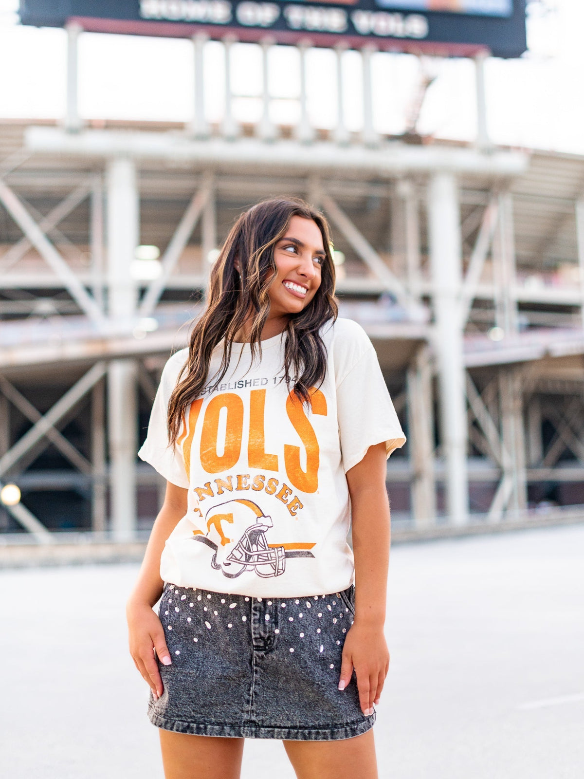 Get ready to show off your team spirit with the Vols Established Date Helmet Thrifted Tee! This unique tee features a vintage helmet design and the established date of your favorite team. Perfect for game day or everyday wear, this tee is a must-have for any die-hard fan. (Go Vols!)