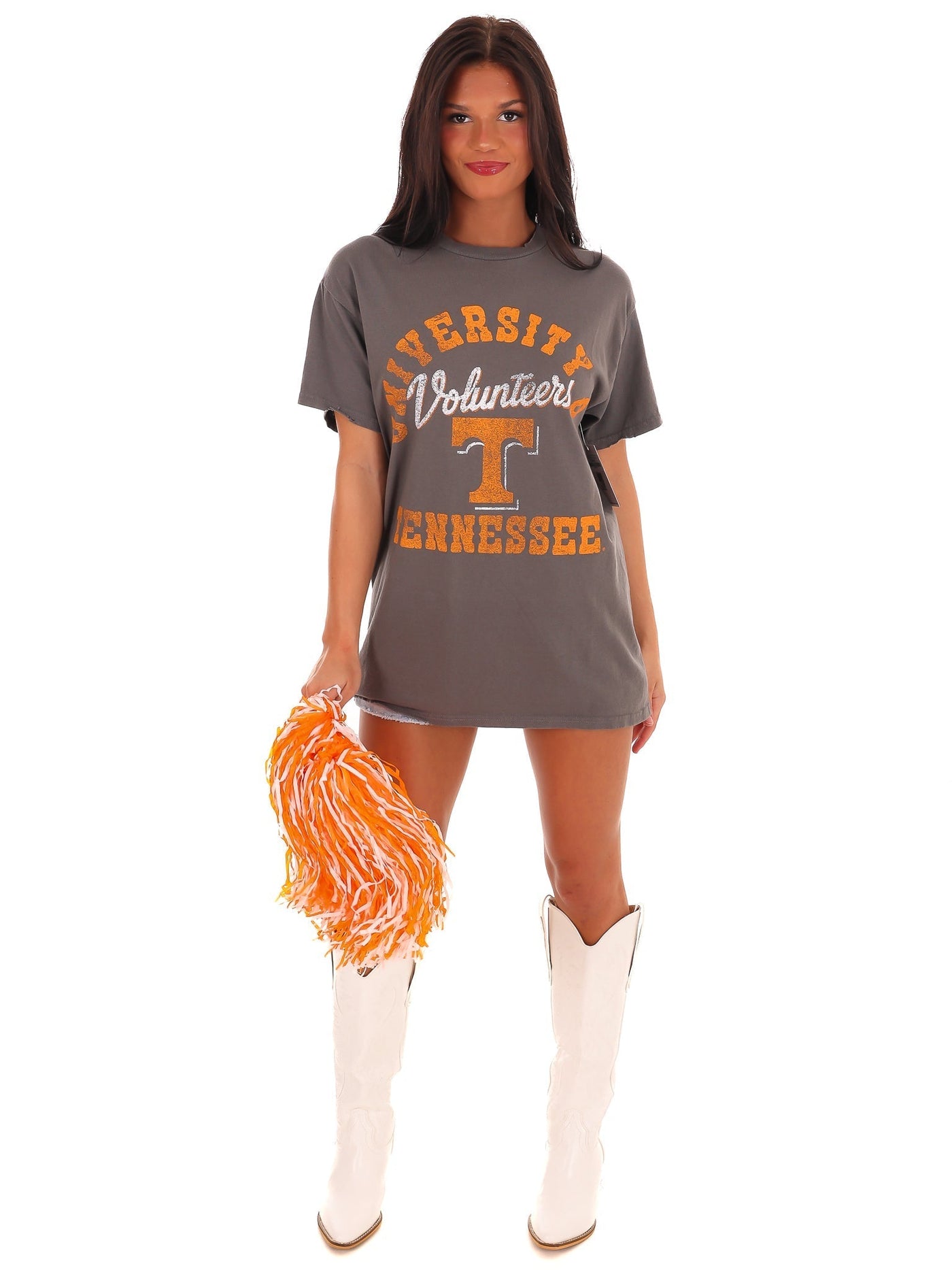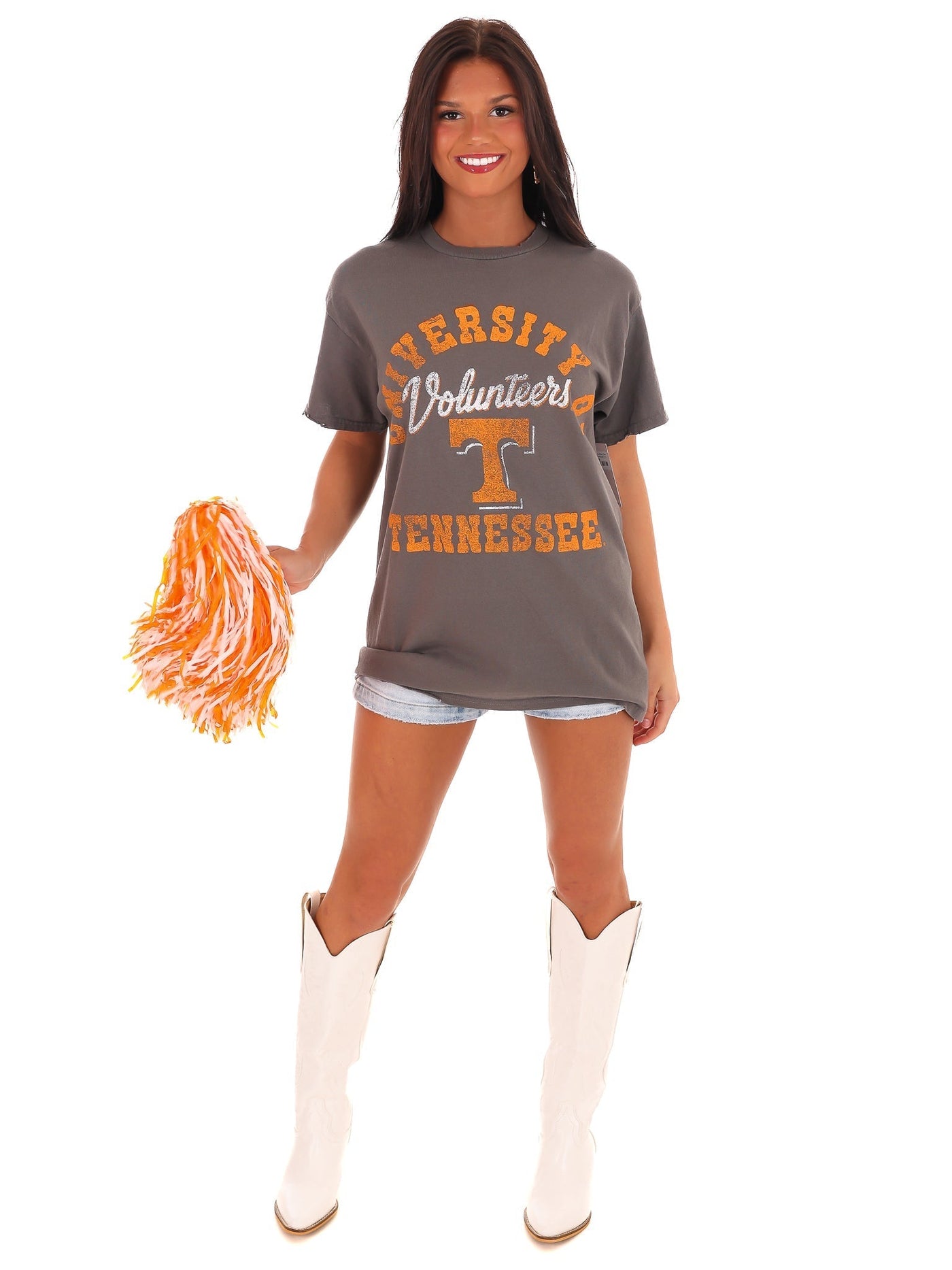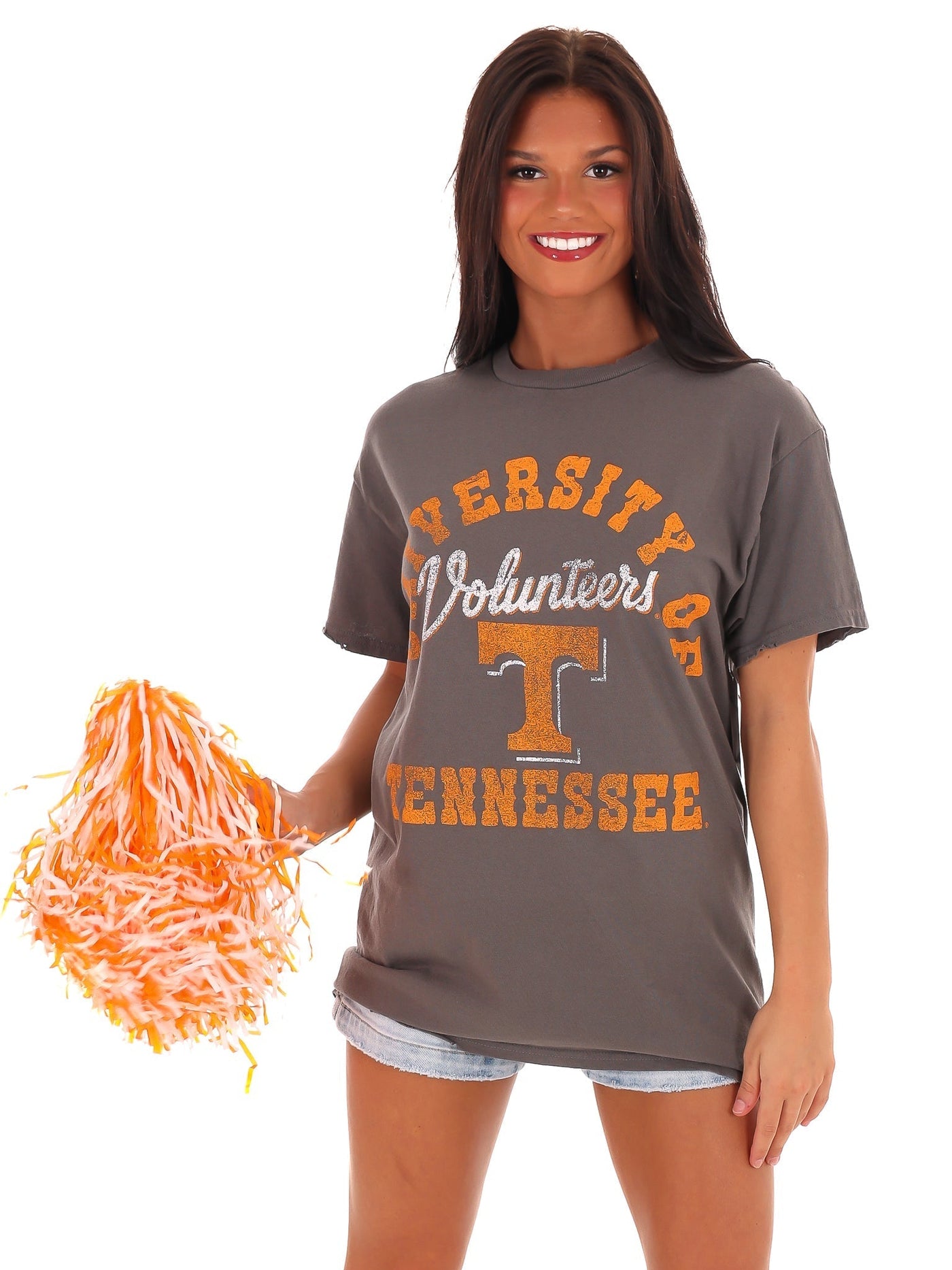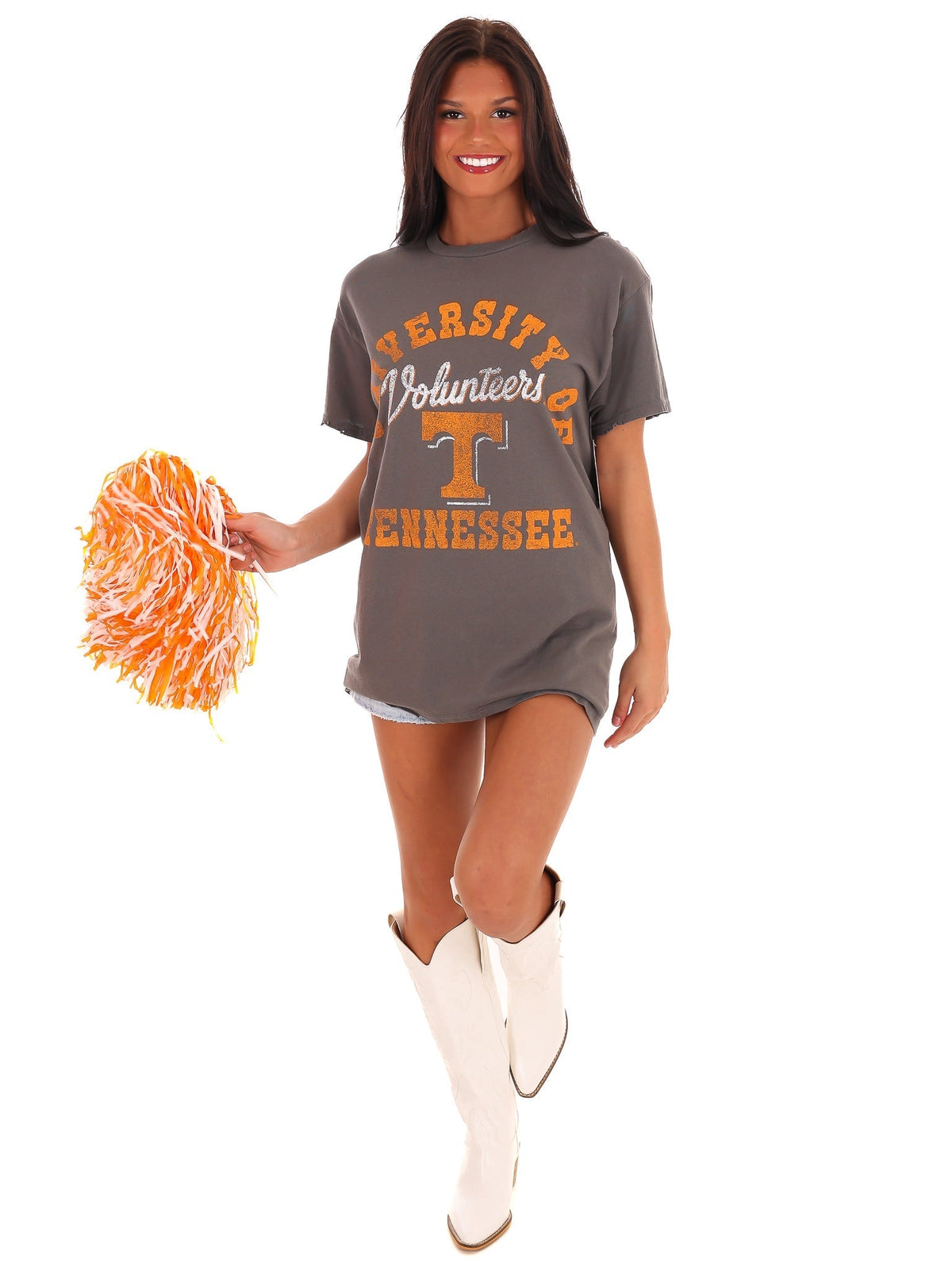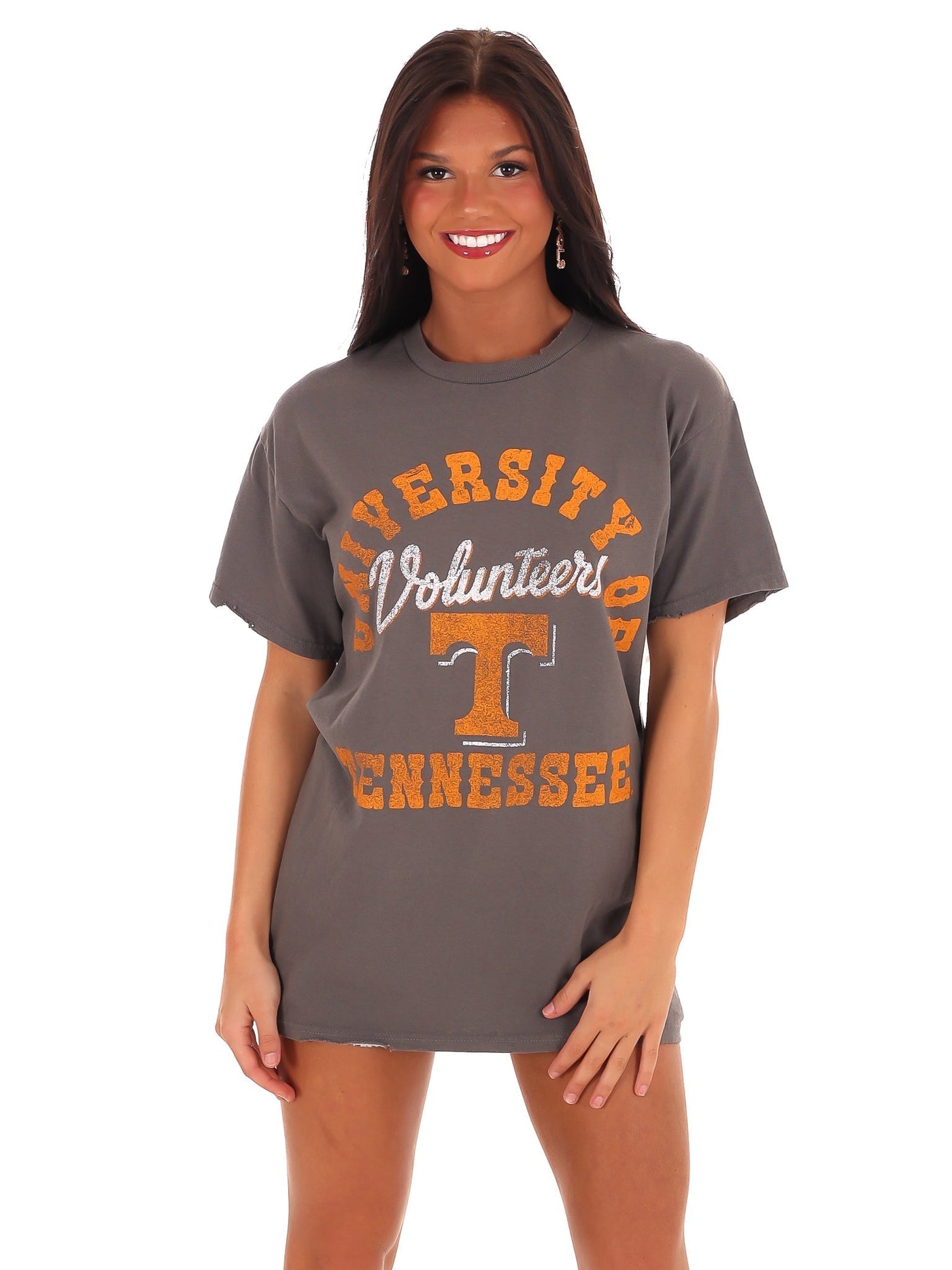 Get ready for gameday with this Volunteers Draft Thrifted Tee! Featuring a distressed University of Tennessee graphic on a charcoal tee, this unique shirt is perfect for any fan. With its playful and quirky style, this shirt is sure to make a statement at any game. Go Vols!