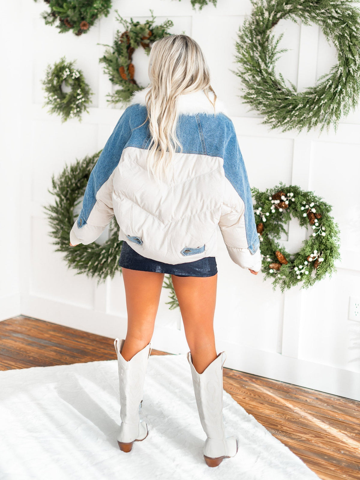 Stay warm and cozy with this denim puffer jacket! Featuring an attachable faux fur collar, button up style, and side pockets, this piece is the perfect way to keep your look both stylish and comfortable. Make sure to snag yours before it's gone!