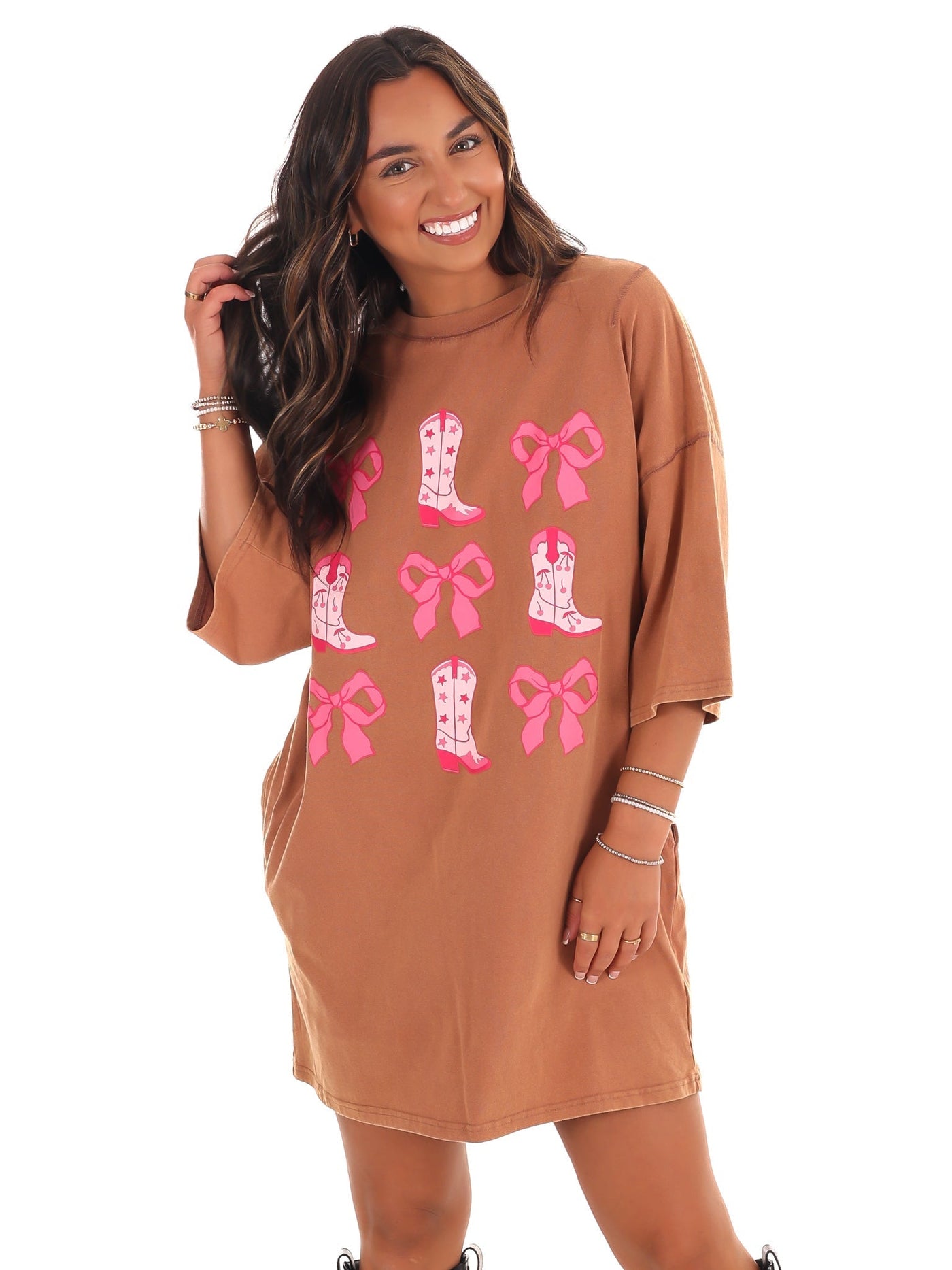 Washed Ribbon & Western Boots T-Shirt Dress - Brown / S