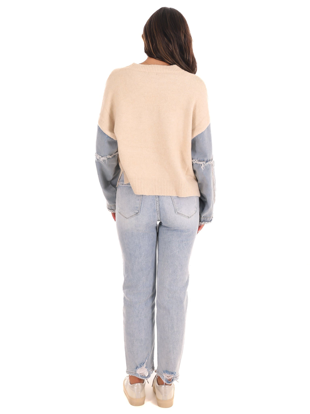 Get ready to rock those weekend vibes with our "Weekend" pullover sweater! With stylish denim sleeves, this sweater is perfect for a day of relaxation or a night out on the town. Stay cozy and stylish with this must-have addition to your wardrobe.