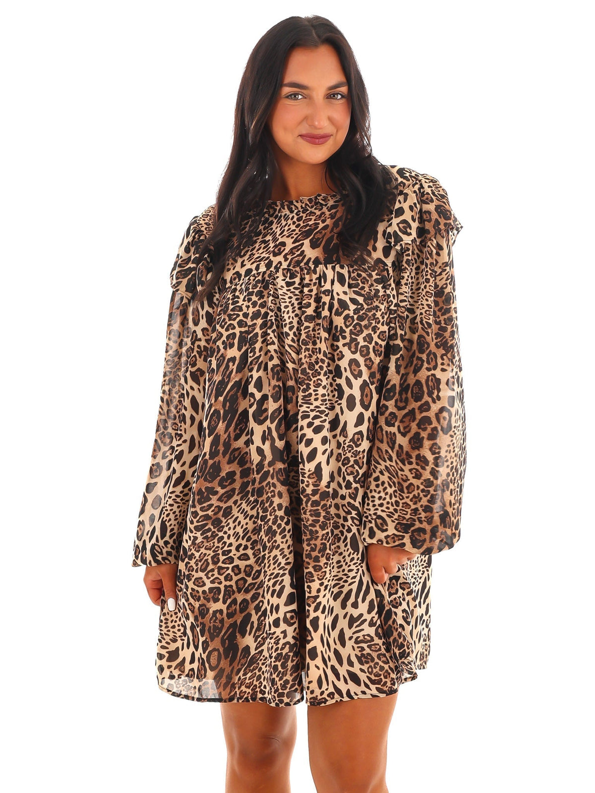 Unleash your wild side with our Wild Heart Leopard Mini Dress. Featuring a sheer chiffon material adorned with playful ruffles and a comfortable lining, this dress is sure to make you stand out in any crowd. Perfect for a night out, festival, or day out with friends. Go wild (but look cute doing it).