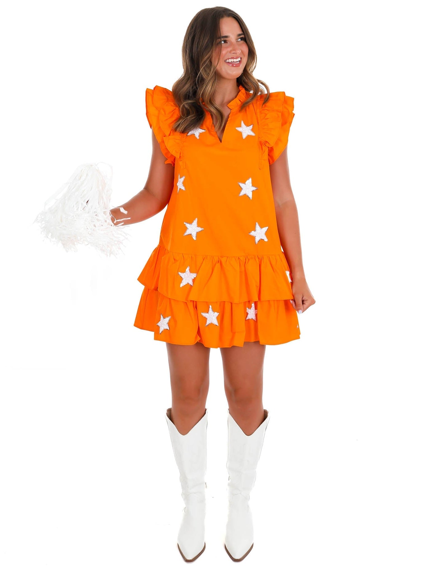 Cheer on your favorite team in style with this Win It All Sequin Star Dress! It's perfect for pep rallies, tailgates, or any gameday celebration. With its tiered hem, V-neckline, and adorable ruffle sleeves — not to mention those dazzling stars! — you'll be the star of the show... No matter who wins the game. Go Vols!