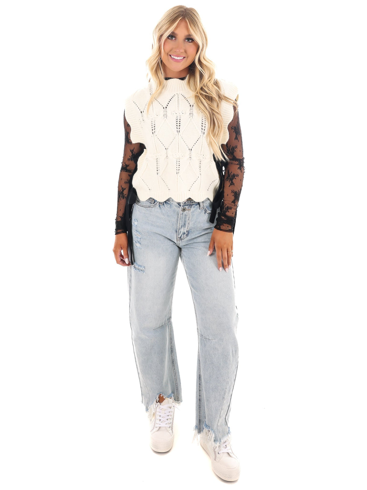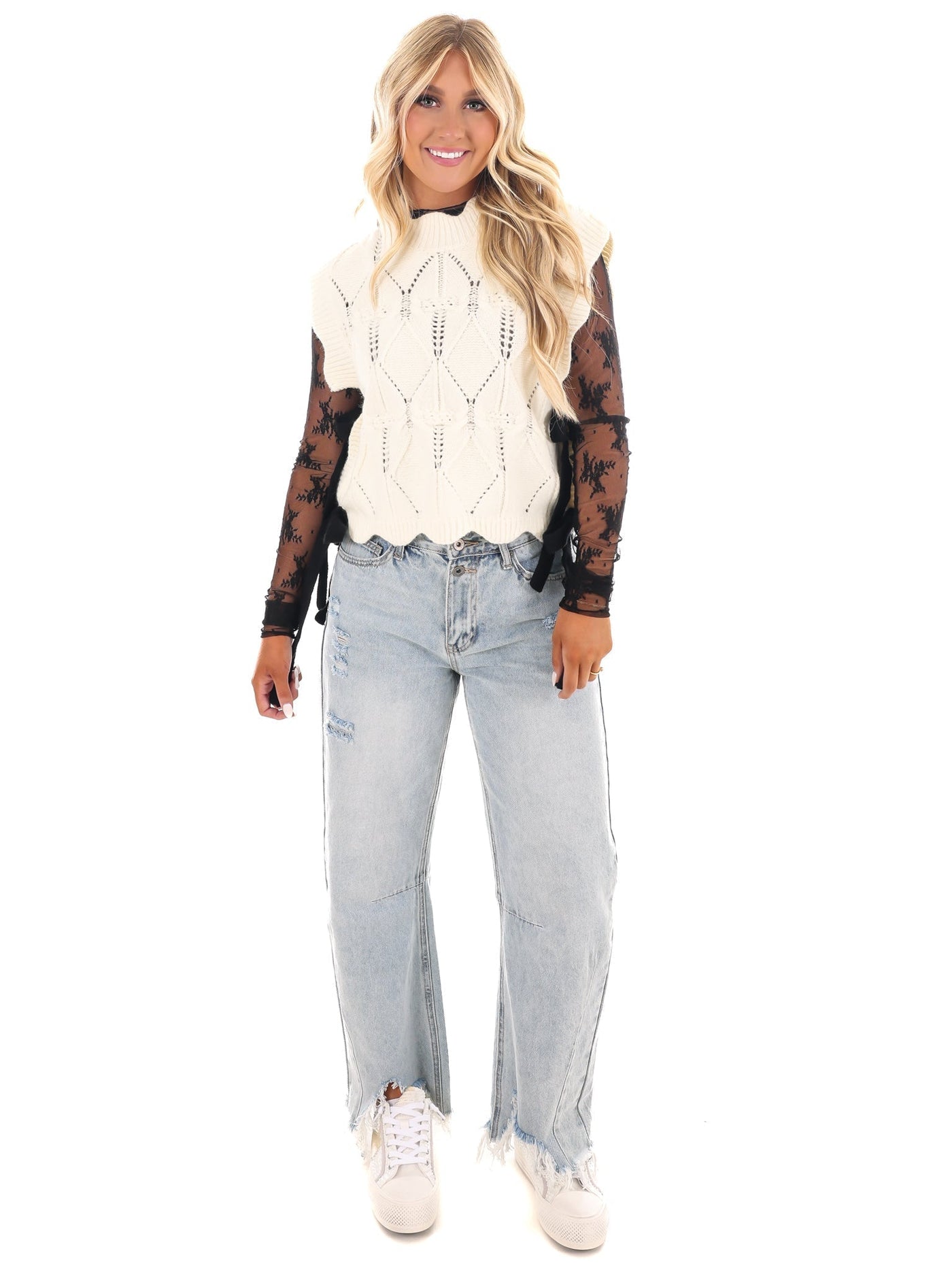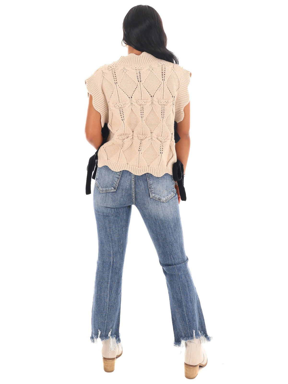Elevate your style with our Wonderful Soul Scalloped Sweater Vest! This cable knit vest features a unique scallop detail and a contrast color side bow tie, adding a touch of whimsy to any outfit. Stay cozy and chic at the same time!
